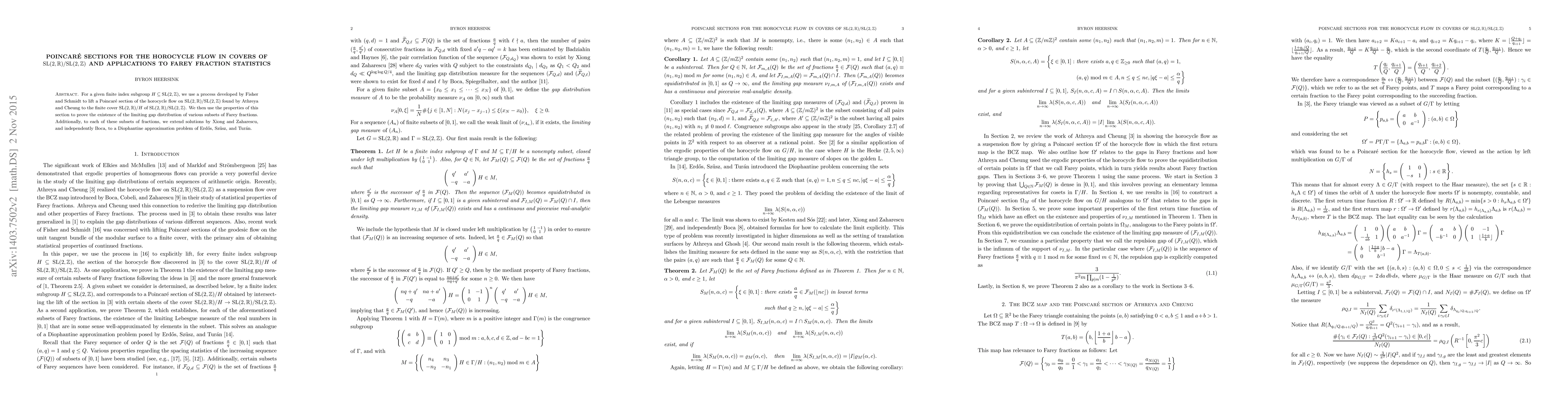 This paper lifts a Poincaré section of the horocycle flow from SL(2,R)/SL(2,Z) to a finite cover SL(2,R)/H using a method by Fisher and Schmidt, and uses this to establish the limiting gap distribution for subsets of Farey fractions. It also extends solutions to a Diophantine approximation problem for these subsets.