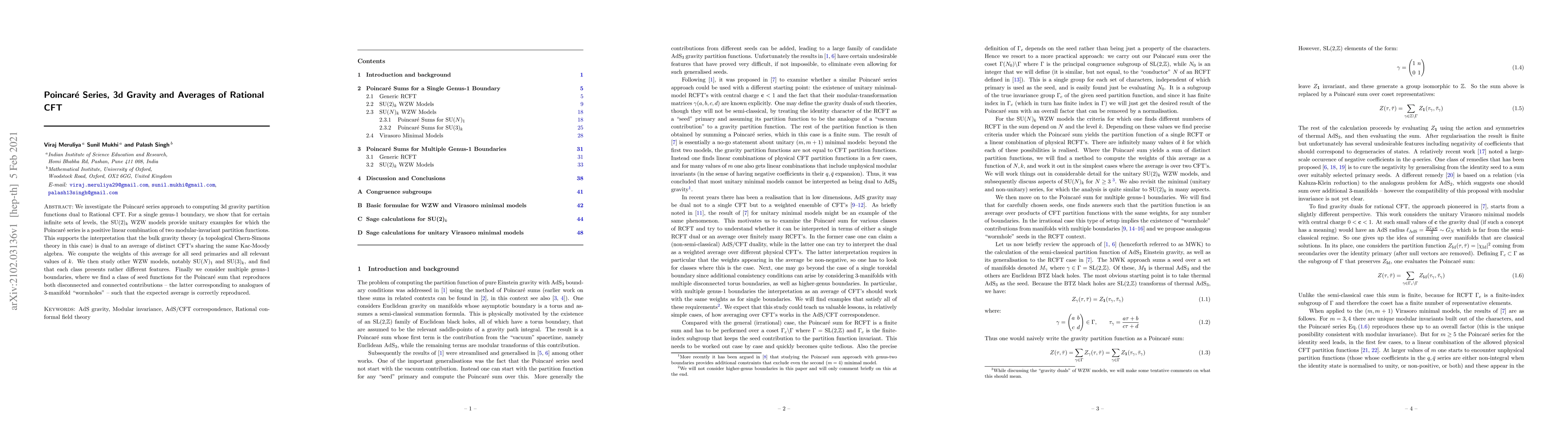 This paper explores the Poincaré series for 3d gravity partition functions dual to Rational Conformal Field Theories (CFT) and finds that SU(2)_k WZW models yield unitary examples where the Poincaré series is a positive linear combination of modular-invariant partition functions, supporting the duality between bulk gravity and an average of distinct CFTs. It also examines other WZW models and multiple genus-1 boundaries, identifying seed functions for Poincaré sums that reproduce both disconnected and connected contributions.