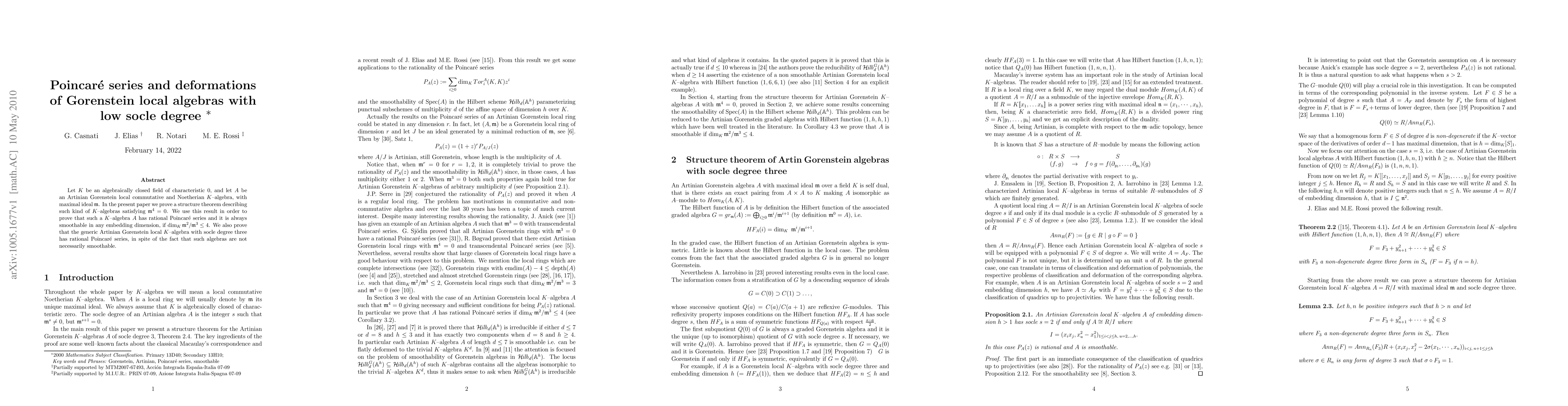 This paper proves a structure theorem for Artinian Gorenstein local algebras with $M^4=0$, showing they have rational Poincar\'e series and are smoothable under certain conditions. It also shows that generic Artinian Gorenstein local algebras with socle degree three have rational Poincar\'e series, despite not always being smoothable.