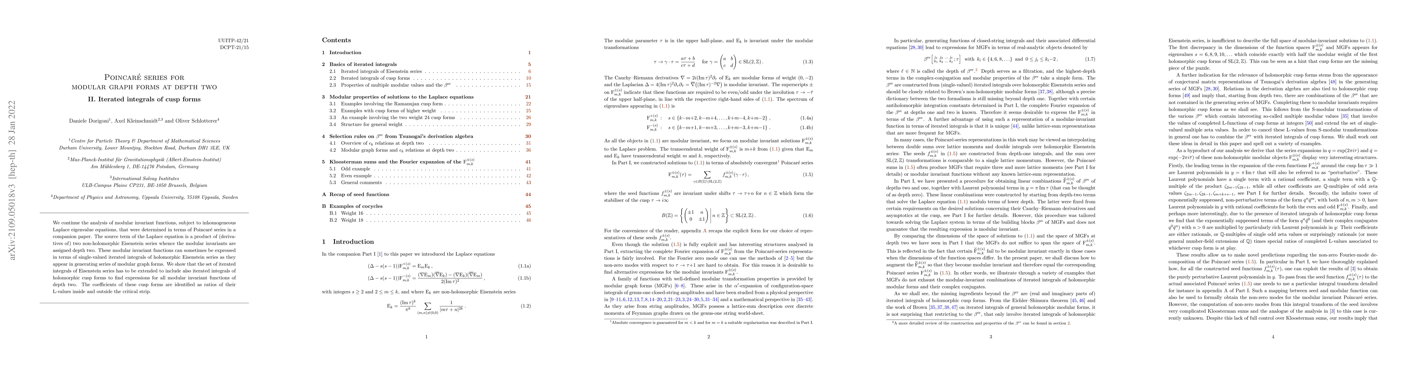 This paper extends the study of modular invariant functions defined by Poincaré series in a companion paper, focusing on functions at depth two derived from inhomogeneous Laplace eigenvalue equations involving non-holomorphic Eisenstein series. It shows that iterated integrals of holomorphic cusp forms must be included alongside Eisenstein series to fully express these invariants, with cusp form coefficients identified as ratios of their L-values.
