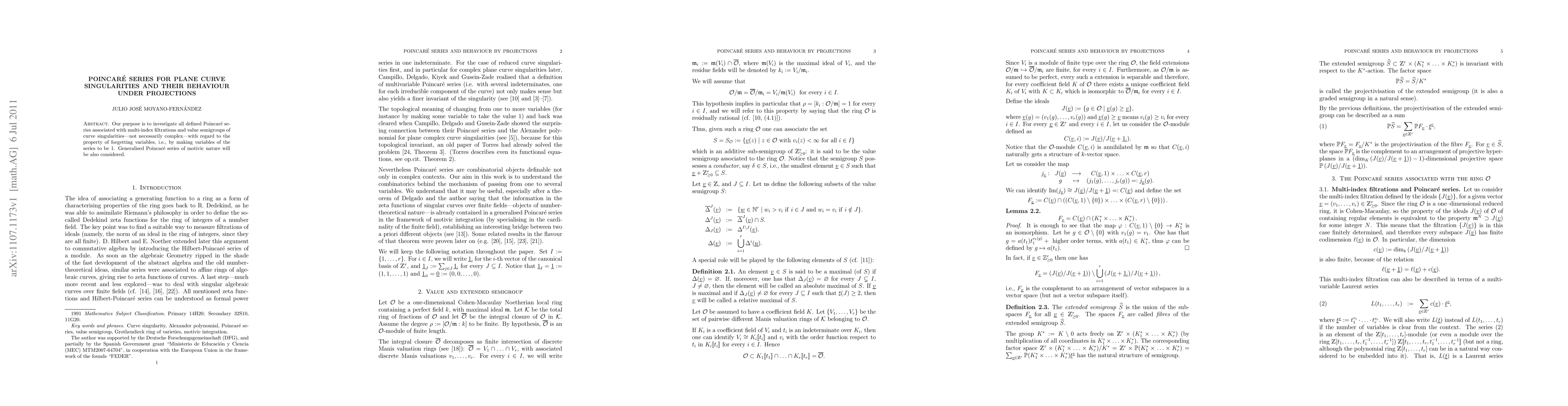 This paper explores the Poincar\'e series linked to plane curve singularities, focusing on their behavior under variable projection, including generalized motivic series and multi-index filtrations. It examines how these series change when variables are set to 1.