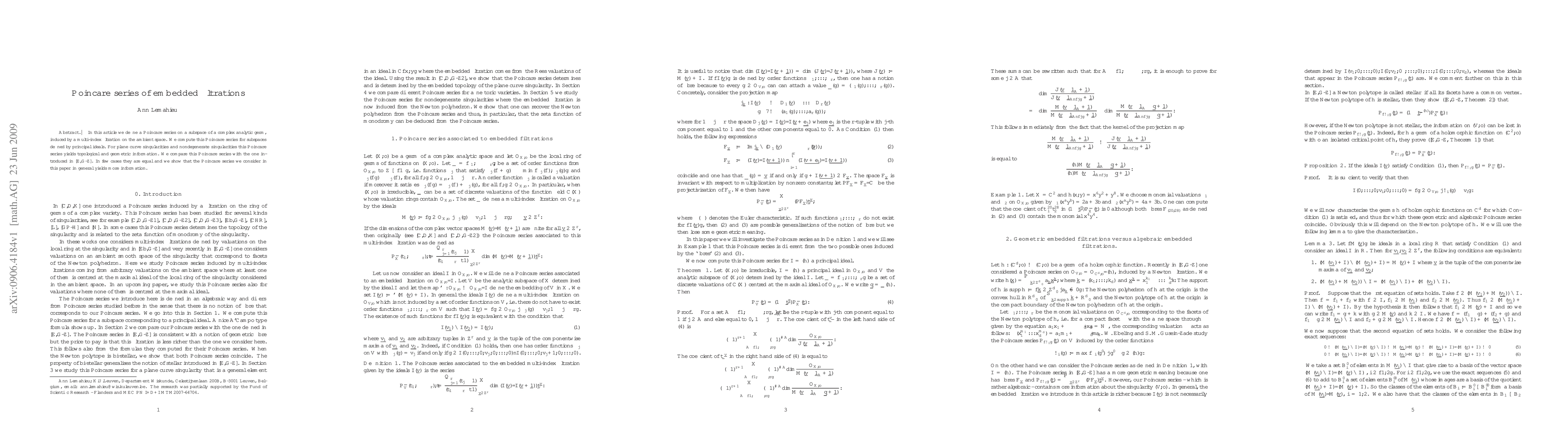 In this article we define a Poincare series on a subspace of a complex analytic germ, induced by a multi-index filtration on the ambient space. We compute this Poincare series for subspaces defined by principal ideals. For plane curve singularities and nondegenerate singularities this Poincare series yields topological and geometric information. We compare this Poincare series with the one introduced in [E,G-Z]. In few cases they are equal and we show that the Poincare series we consider in this paper in general yields more information.
