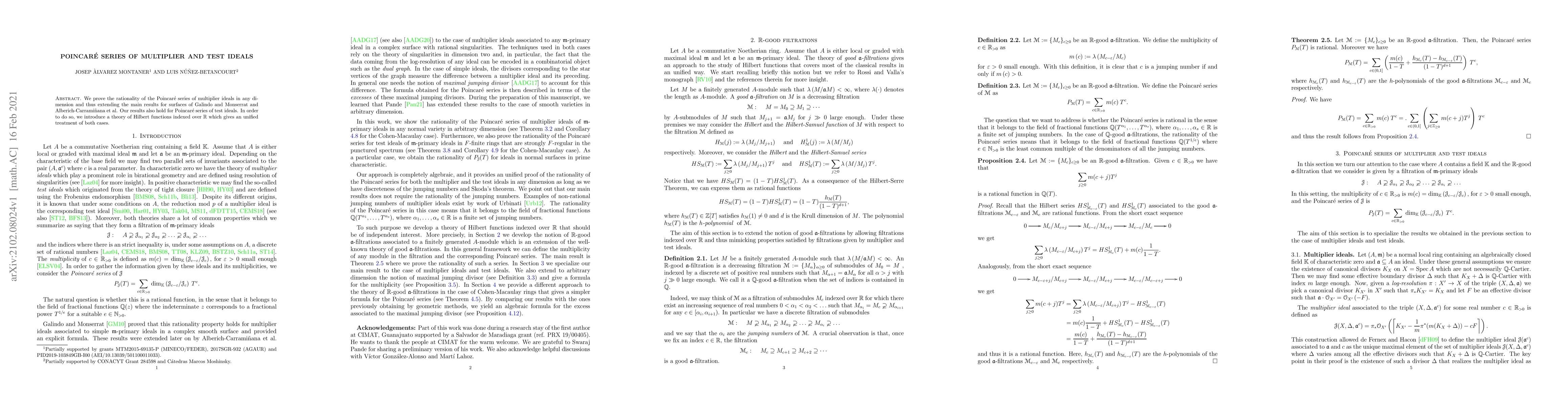 Summary: This paper establishes the rationality of Poincar\'e series for multiplier and test ideals across all dimensions, extending previous results for surfaces, and introduces a new theory of Hilbert functions over $\mathbb{R}$ to unify these concepts.