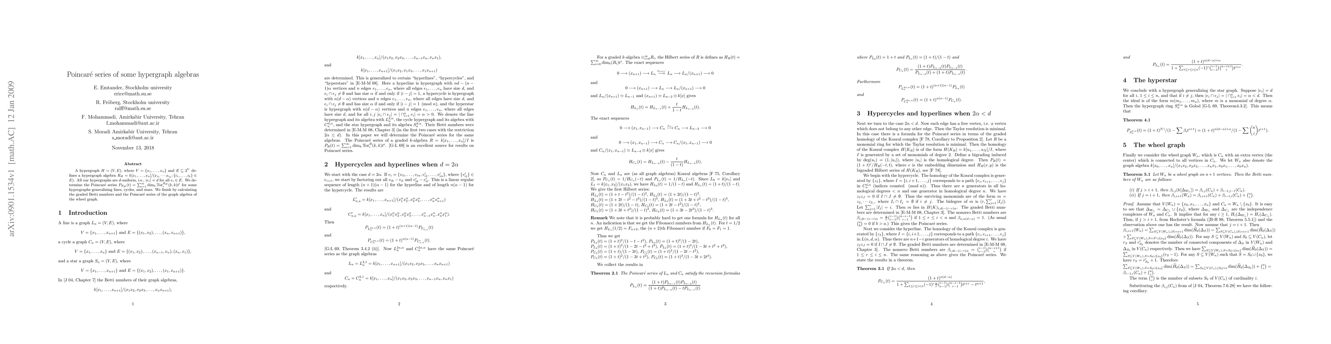This paper determines the Poincar\'e series for a class of $d$-uniform hypergraph algebras, generalizing structures like lines, cycles, and stars. It concludes with calculations for the graded Betti numbers and the Poincar\'e series of the graph algebra of the wheel graph.