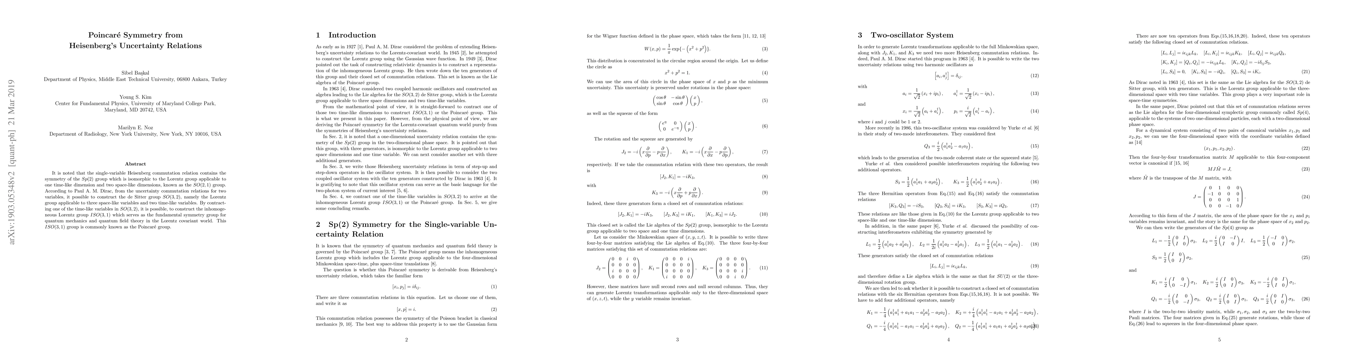 The paper explores how Heisenberg's uncertainty relations imply symmetries akin to the $O(2,1)$ and $O(3,2)$ groups, ultimately leading to the construction of the inhomogeneous Lorentz group $IO(3,1)$, or the Poincaré group, which underpins the symmetry of quantum mechanics and quantum field theory.