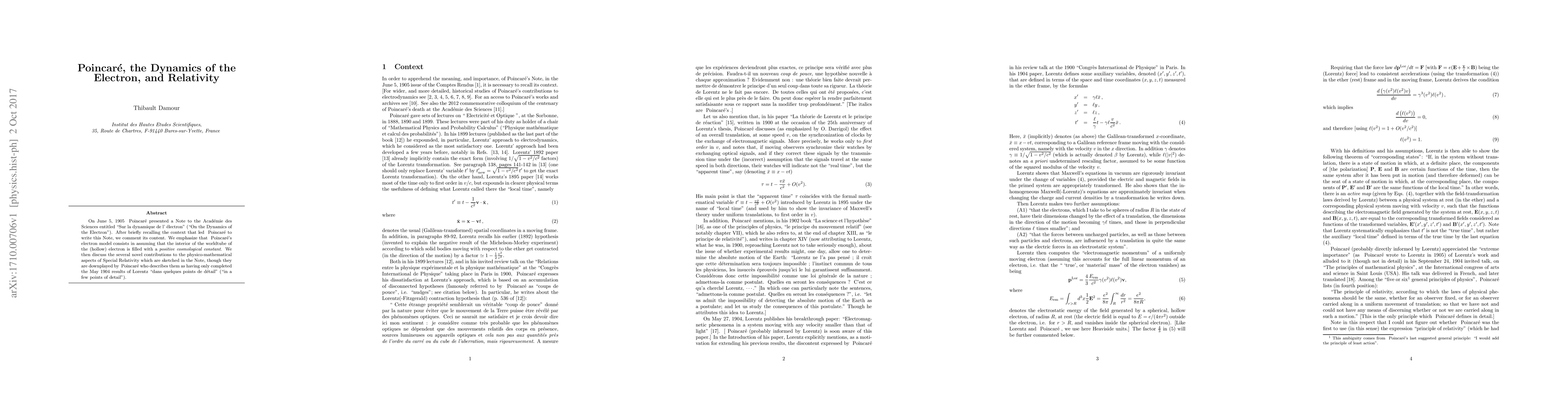 Poincaré's 1905 "Note on the Dynamics of the Electron" introduces a model where the hollow electron's interior is filled with a positive cosmological constant, and it outlines novel contributions to the physico-mathematical aspects of Special Relativity, though he credits Lorentz for the foundational ideas.