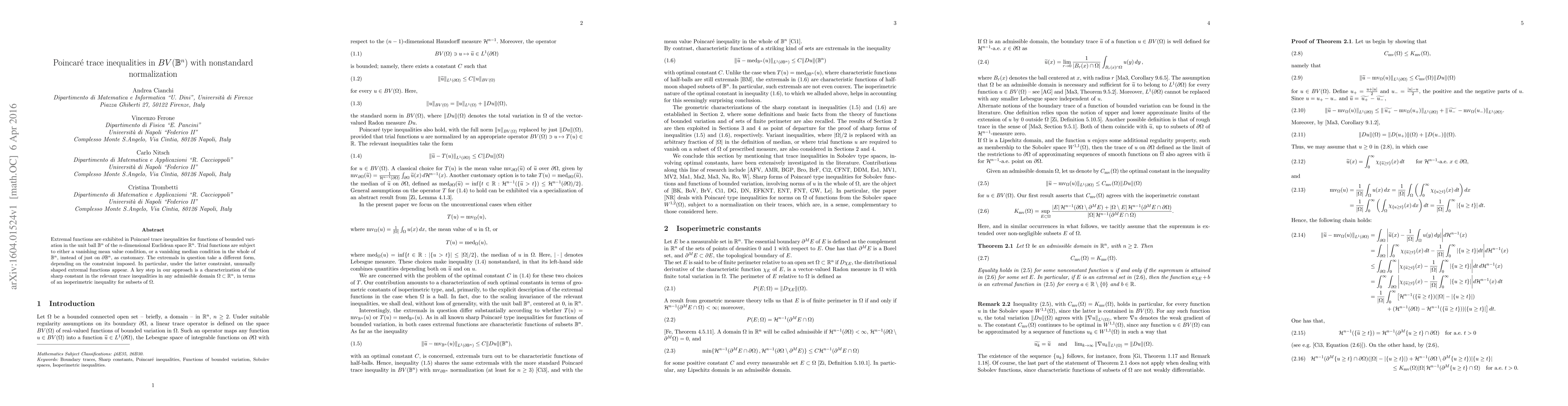 Extremal functions are exhibited in Poincar\'e trace inequalities for functions of bounded variation in the unit ball ${\mathbb B}^n$ of the $n$-dimensional Euclidean space ${\mathbb R}^n$. Trial functions are subject to either a vanishing mean value condition, or a vanishing median condition in the whole of ${\mathbb B}^n$, instead of just on $\partial {\mathbb B}^n$, as customary. The extremals in question take a different form, depending on the constraint imposed. In particular, under the latter constraint, unusually shaped extremal functions appear. A key step in our approach is a characterization of the sharp constant in the relevant trace inequalities in any admissible domain $\Omega \subset {\mathbb R}^n$, in terms of an isoperimetric inequality for subsets of $\Omega$.