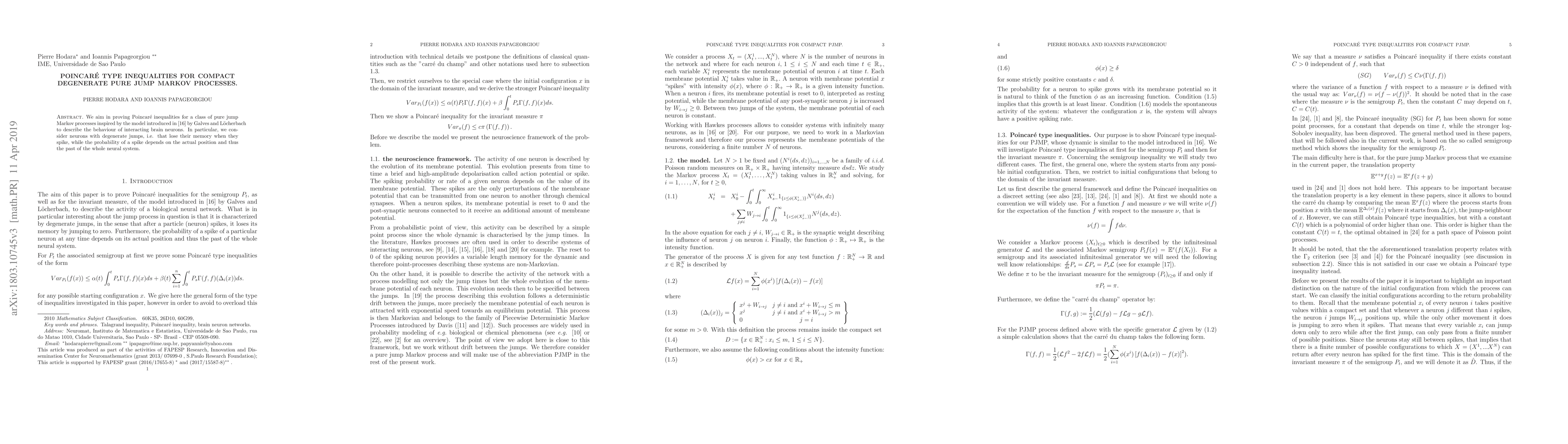 This paper proves Poincaré inequalities for pure jump Markov processes with degenerate jumps, modeling neurons that lose memory upon spiking, where spike probability depends on the current state and history of the neural system. The model is inspired by Galves and Löcherbach's work on interacting brain neurons.