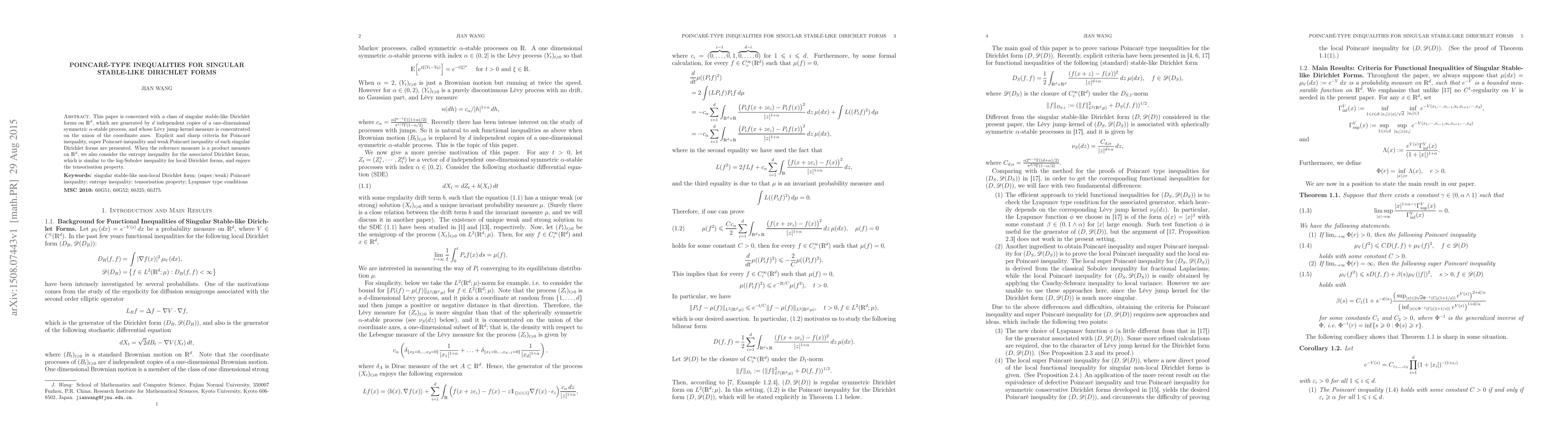 This paper is concerned with a class of singular stable-like Dirichlet forms on $\R^d$, which are generated by $d$ independent copies of a one-dimensional symmetric $\alpha$-stable process, and whose L\'evy jump kernel measure is concentrated on the union of the coordinate axes. Explicit and sharp criteria for Poincar\'e inequality, super Poincar\'e inequality and weak Poincar\'e inequality of such singular Dirichlet forms are presented. When the reference measure is a product measure on $\R^d$, we also consider the entropy inequality for the associated Dirichlet forms, which is similar to the log-Sobolev inequality for local Dirichlet forms, and enjoys the tensorisation property.