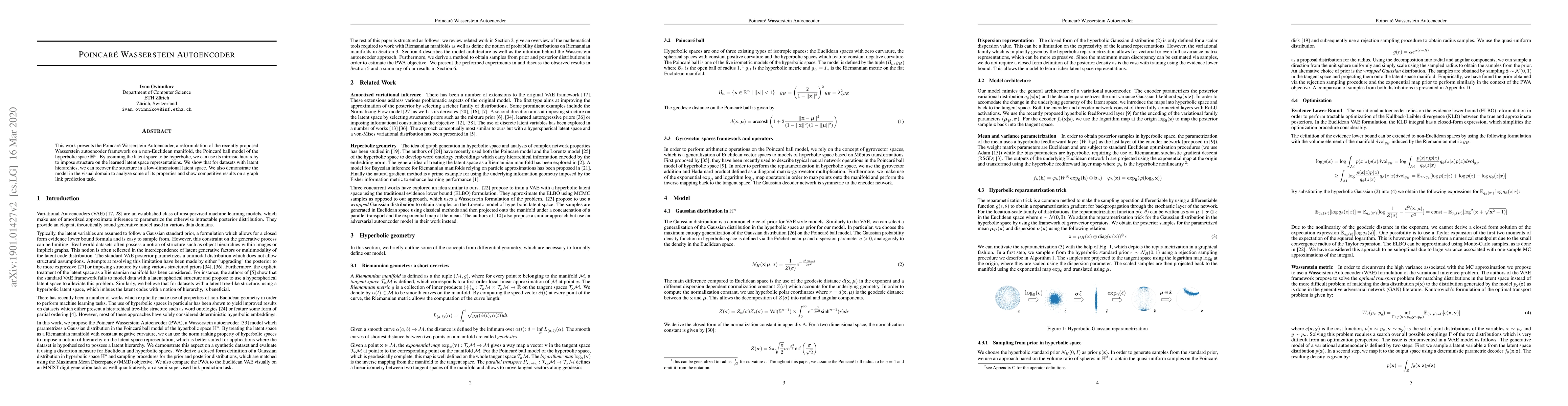 This paper reformulates the Wasserstein autoencoder framework on the hyperbolic Poincaré ball, leveraging its intrinsic hierarchy to structure latent space representations. The model shows competitive results in a graph link prediction task, demonstrating its effectiveness in the visual domain.