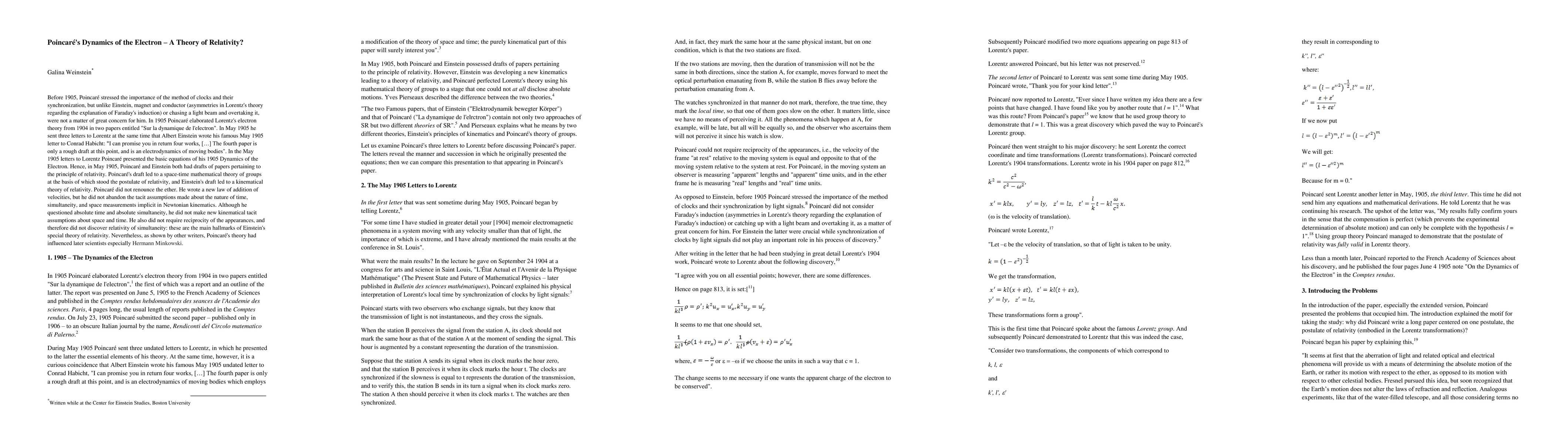 Before 1905, Poincar\'e stressed the importance of the method of clocks and their synchronization, but unlike Einstein, magnet and conductor (asymmetries in Lorentz's theory regarding the explanation of Faraday's induction) or chasing a light beam and overtaking it, were not a matter of great concern for him. In 1905 Poincar\'e elaborated Lorentz's electron theory from 1904 in two papers entitled "Sur la dynamique de l'electron". In May 1905 he sent three letters to Lorentz at the same time that Albert Einstein wrote his famous May 1905 letter to Conrad Habicht: "I can promise you in return four works,[...] The fourth paper is only a rough draft at this point, and is an electrodynamics of moving bodies". In the May 1905 letters to Lorentz Poincar\'e presented the basic equations of his 1905 Dynamics of the Electron. Hence, in May 1905, Poincar\'e and Einstein both had drafts of papers pertaining to the principle of relativity. Poincar\'e's draft led to a space-time mathematical theory of groups at the basis of which stood the postulate of relativity, and Einstein's draft led to a kinematical theory of relativity. Poincar\'e did not renounce the ether. He wrote a new law of addition of velocities, but he did not abandon the tacit assumptions made about the nature of time, simultaneity, and space measurements implicit in Newtonian kinematics. Although he questioned absolute time and absolute simultaneity, he did not make new kinematical tacit assumptions about space and time. He also did not require reciprocity of the appearances, and therefore did not discover relativity of simultaneity: these are the main hallmarks of Einstein's special theory of relativity. Nevertheless, as shown by other writers, Poincar\'e's theory had influenced later scientists especially Hermann Minkowski.