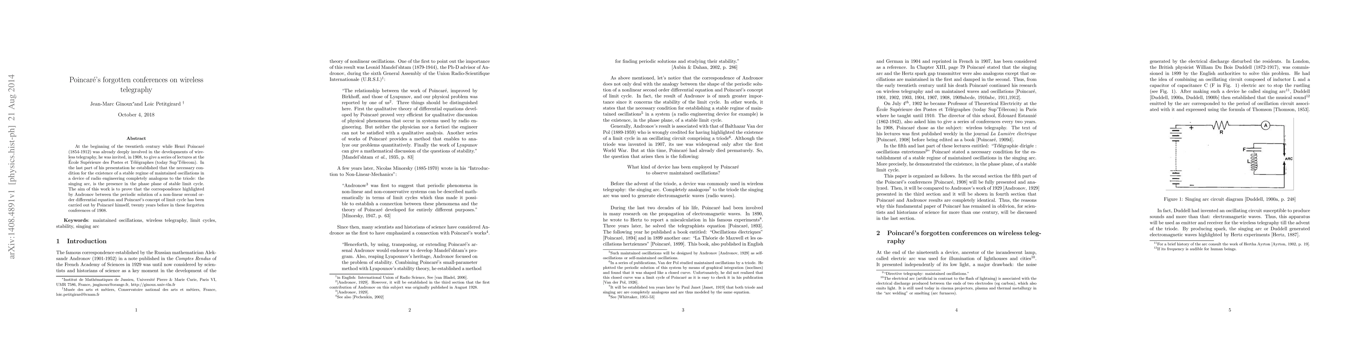 At the beginning of the twentieth century while Henri Poincar\'e (1854-1912) was already deeply involved in the developments of wireless telegraphy, he was invited, in 1908, to give a series of lectures at the \'Ecole Sup\'erieure des Postes et T\'el\'egraphes (today Sup'T\'elecom). In the last part of his presentation he established that the necessary condition for the existence of a stable regime of maintained oscillations in a device of radio engineering completely analogous to the triode: the singing arc, is the presence in the phase plane of stable limit cycle. The aim of this work is to prove that the correspondence highlighted by Andronov between the periodic solution of a non-linear second order differential equation and Poincar\'e's concept of limit cycle has been carried out by Poincar\'e himself, twenty years before in these forgotten conferences of 1908.