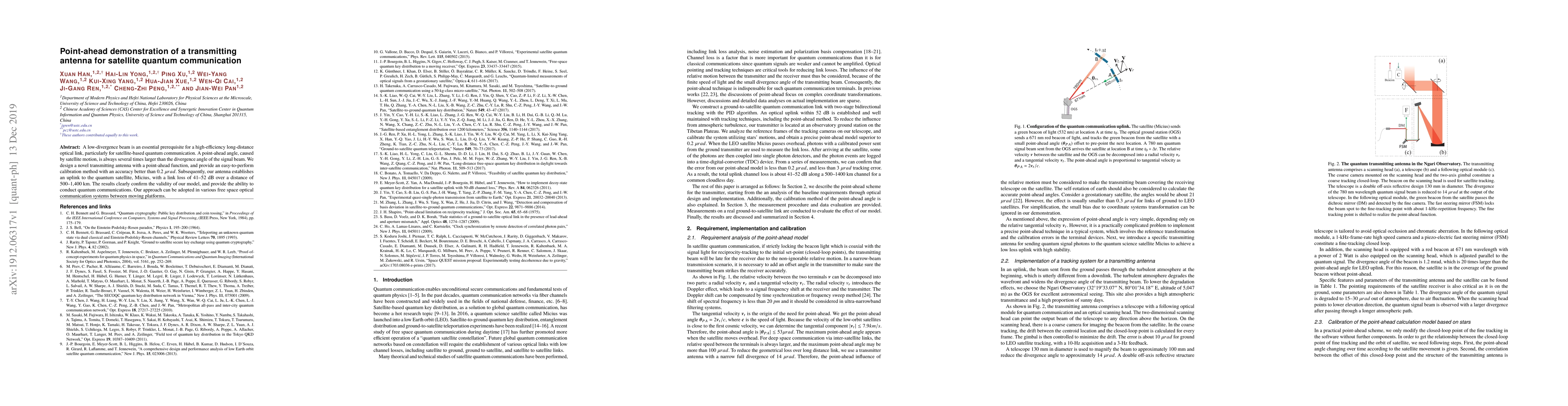 This paper presents a novel transmitting antenna designed to manage the point-ahead angle in satellite-based quantum communication, achieving a low link loss of 41-52 dB over distances of 500-1,400 km. The antenna's calibration method ensures accuracy better than 0.2 urad, demonstrating its effectiveness for quantum communication with the Micius satellite.