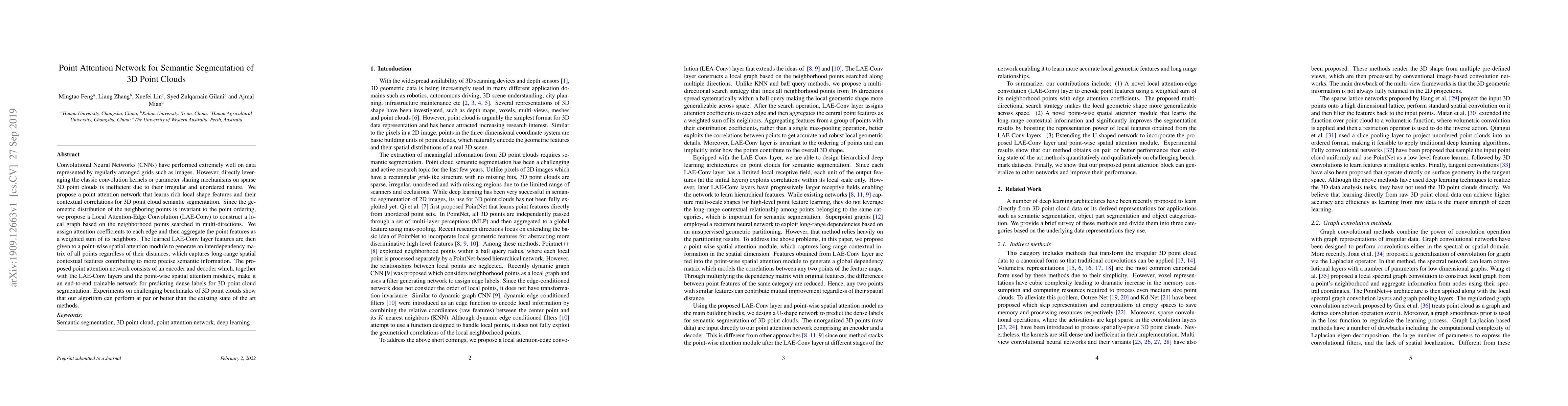 The paper proposes a Point Attention Network for 3D point cloud semantic segmentation, utilizing Local Attention-Edge Convolution (LAE Conv) and point-wise spatial attention to capture local and long-range contextual features efficiently. The network achieves competitive results on benchmark datasets.