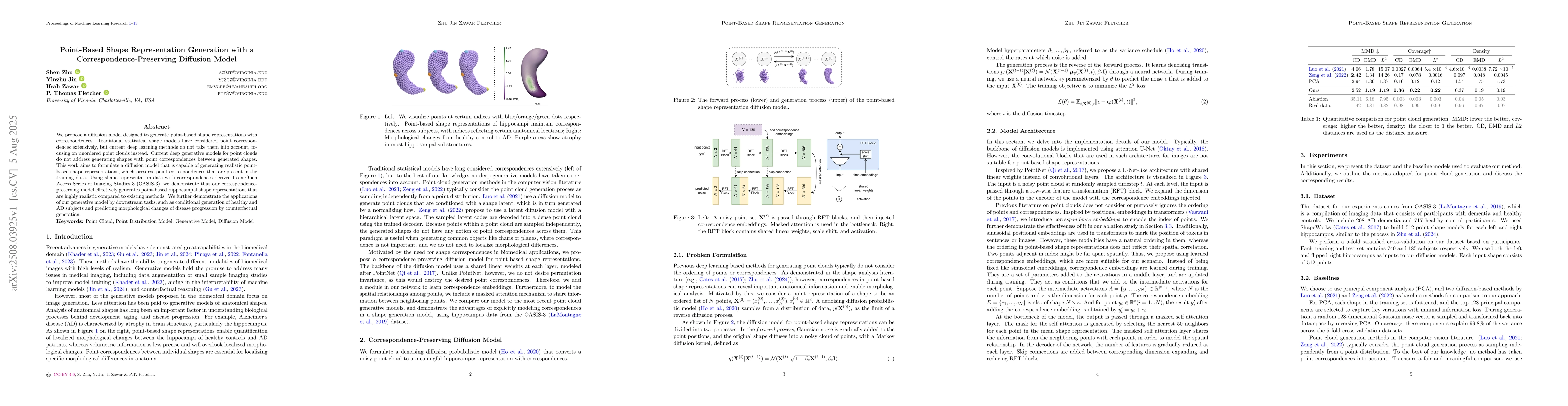 This research introduces a diffusion model that generates point-based shape representations preserving correspondences, addressing a gap in current deep learning methods for point clouds. The model, tested on OASIS-3 data, effectively creates realistic hippocampal shape representations for tasks like conditional generation of healthy vs. Alzheimer's subjects and predicting disease progression via counterfactual generation.