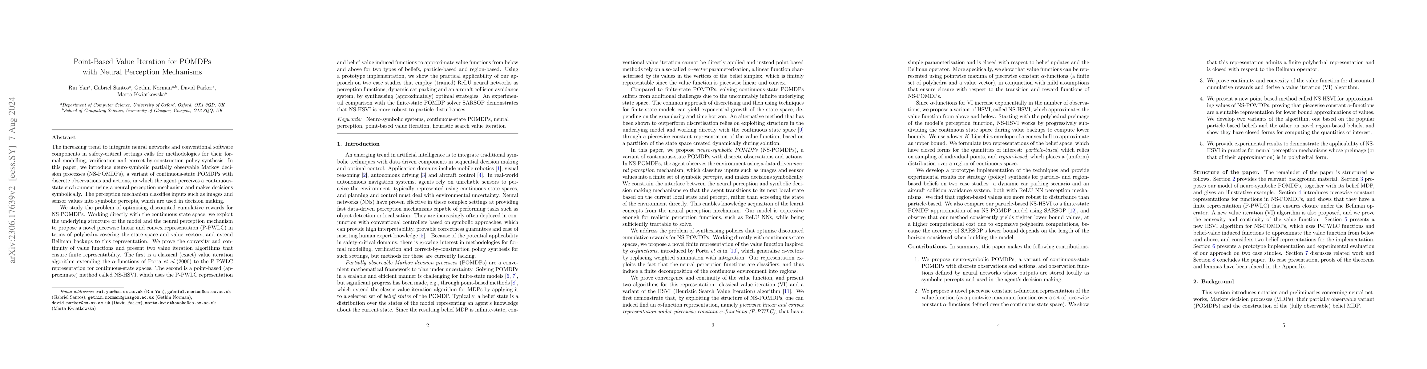 This paper introduces neuro-symbolic partially observable Markov decision processes (NS-POMDPs) that combine neural networks with symbolic techniques for sequential decision making. It proposes a piecewise linear and convex representation for continuous-state beliefs and presents two value iteration algorithms, including an exact method and a point-based NS-HSVI approximation, demonstrating practical applicability in dynamic car parking and aircraft collision avoidance.