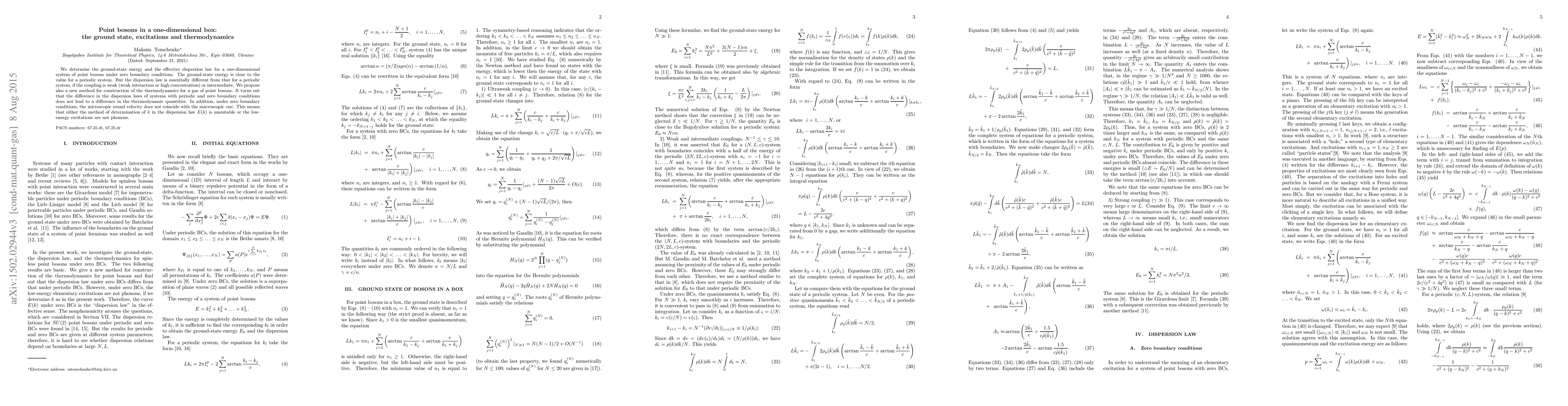 We determine the ground-state energy and the effective dispersion law for a one-dimensional system of point bosons under zero boundary conditions. The ground-state energy is close to the value for a periodic system. But the dispersion law is essentially different from that for a periodic system, if the coupling is weak (weak interaction or high concentration) or intermediate. We propose also a new method for construction of the thermodynamics for a gas of point bosons. It turns out that the difference in the dispersion laws of systems with periodic and zero boundary conditions does not lead to a difference in the thermodynamic quantities. In addition, under zero boundary conditions, the microscopic sound velocity does not coincide with the macroscopic one. This means that either the method of determination of $k$ in the dispersion law $E(k)$ is unsuitable or the low-energy excitations are not phonons.