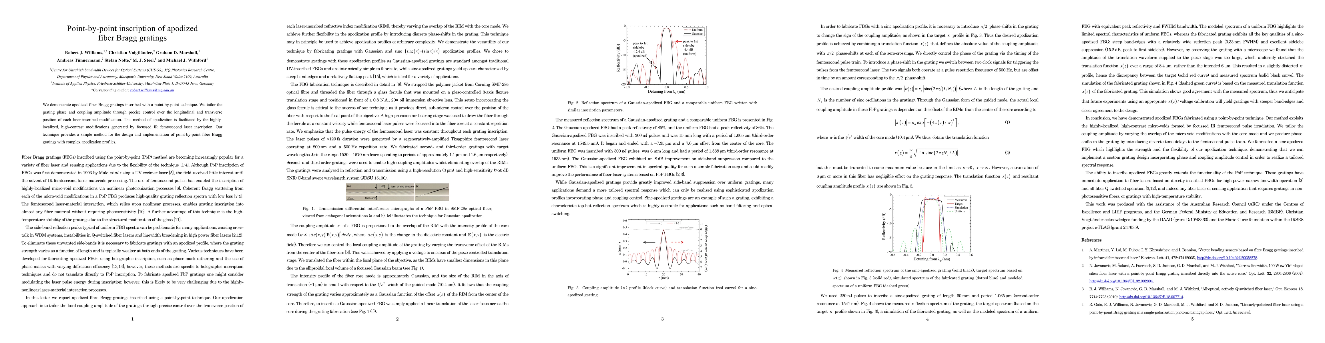 This research demonstrates a point-by-point technique for inscribing apodized fiber Bragg gratings, utilizing precise control over laser modifications to tailor phase and amplitude, and showcases its potential for creating complex apodization profiles with high-contrast femtosecond laser inscription.