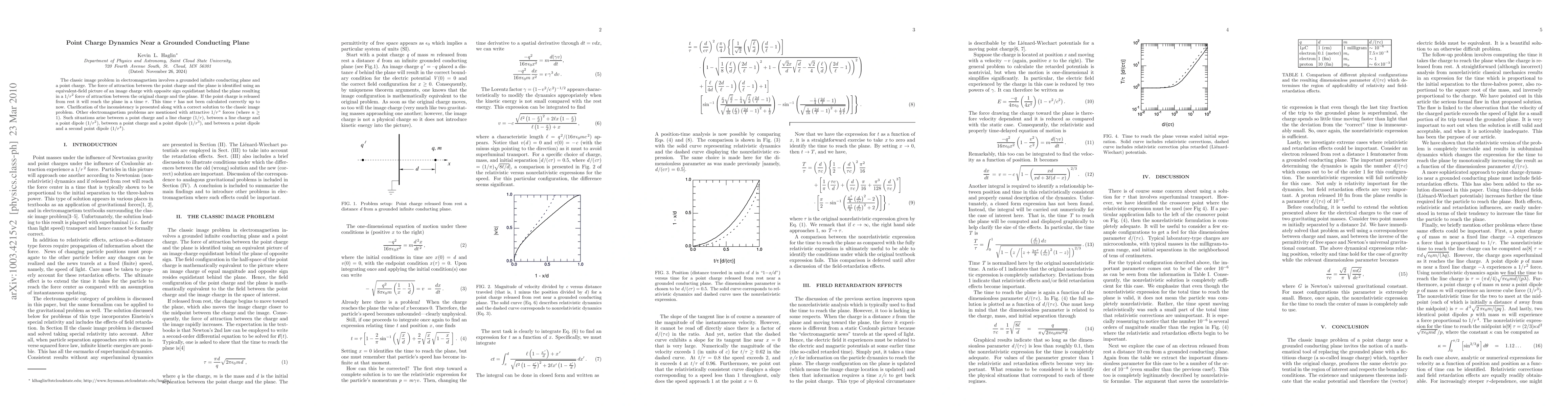 A study corrects a calculation error in determining the time it takes for a point charge to reach a grounded conducting plane, resolving an inconsistency in classic image problem solutions.