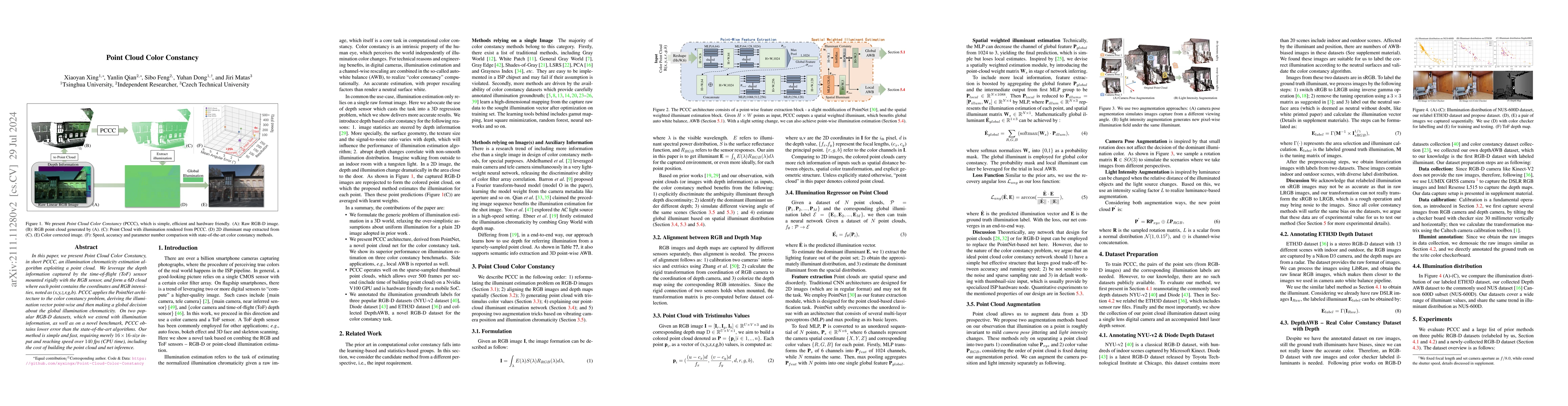 This paper introduces PCCC, a Point Cloud Color Constancy algorithm that uses a point cloud with depth and RGB information to estimate illumination chromaticity. It leverages PointNet architecture for efficient global illumination estimation and achieves lower error rates compared to state-of-the-art methods, operating at over 500 fps.