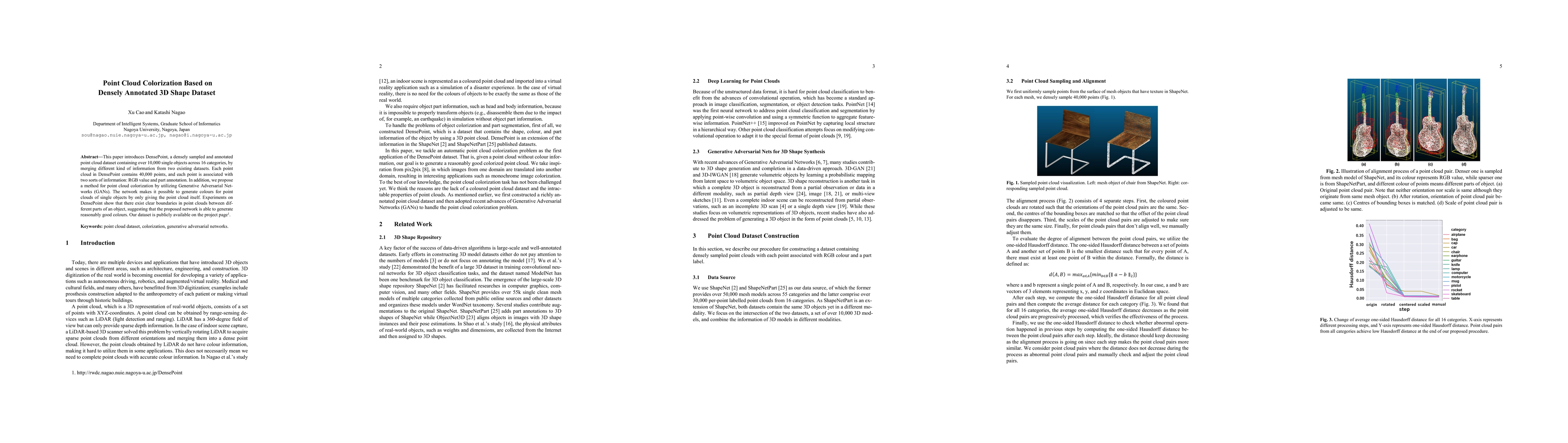 A new dataset called DensePoint is introduced for point cloud colorization, which enables generating colors for single objects from their 3D point clouds using a Generative Adversarial Network.