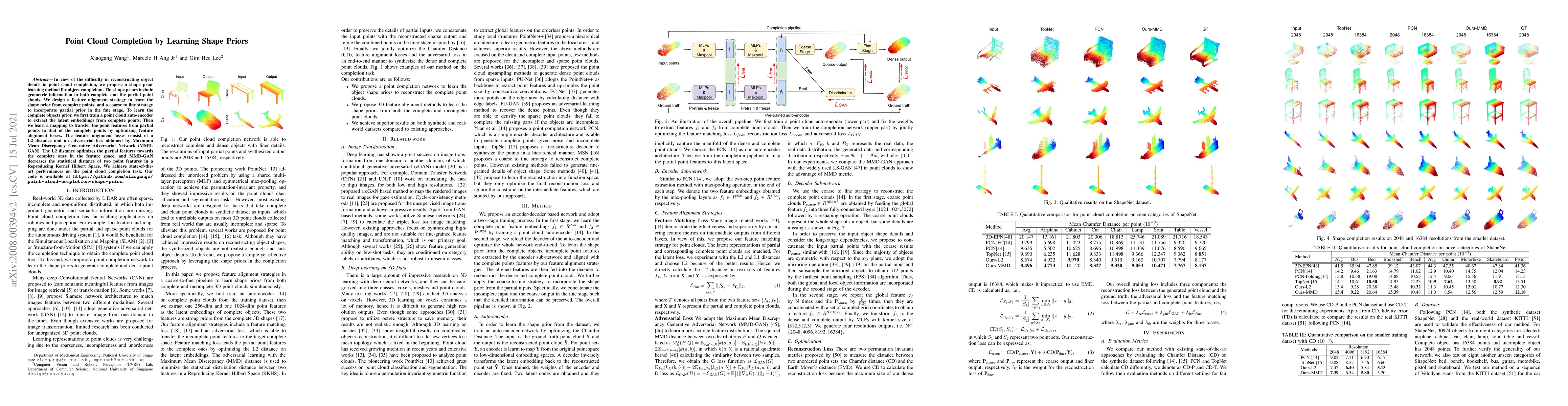 This paper proposes a method for point cloud completion using learned shape priors, incorporating geometric information from both complete and partial point clouds. It employs a feature alignment strategy and a coarse-to-fine approach, utilizing a point cloud auto-encoder and MMD-GAN to optimize feature alignment losses, achieving state-of-the-art results.