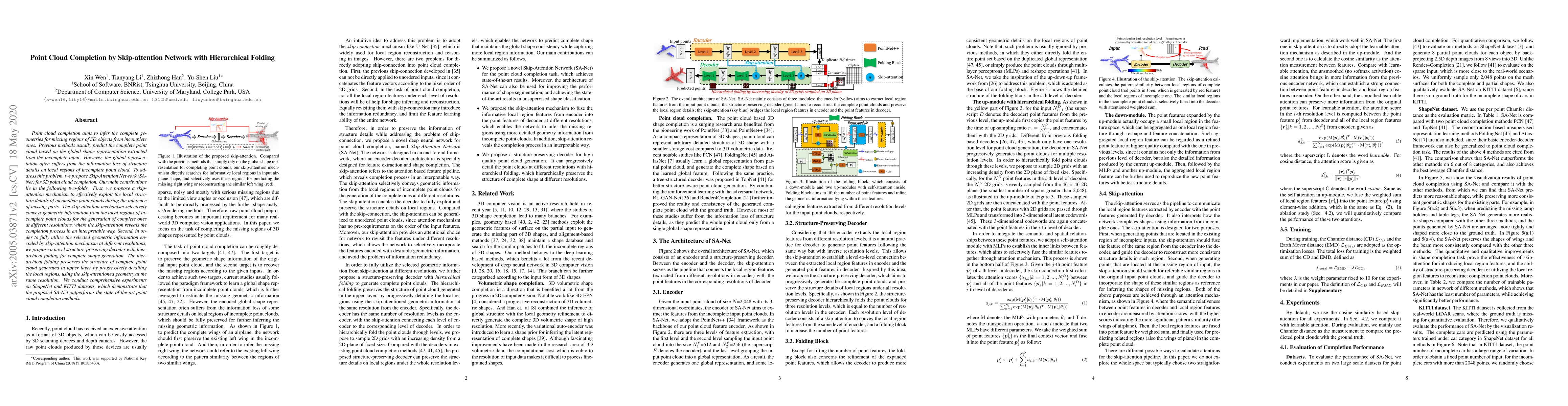 The paper proposes a Skip-Attention Network (SA-Net) for 3D point cloud completion, utilizing a skip-attention mechanism to capture local structure details and a hierarchical folding decoder to generate complete shapes. SA-Net outperforms existing methods on ShapeNet and KITTI datasets.