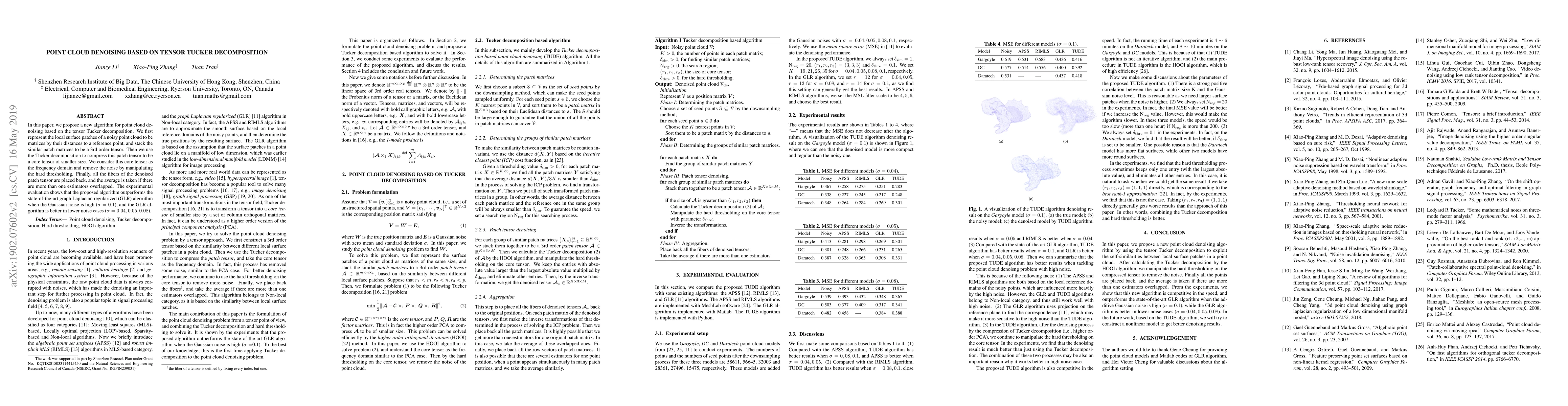 A new point cloud denoising algorithm using tensor Tucker decomposition outperforms state-of-the-art methods in high-noise conditions, but is surpassed by them in lower noise levels.