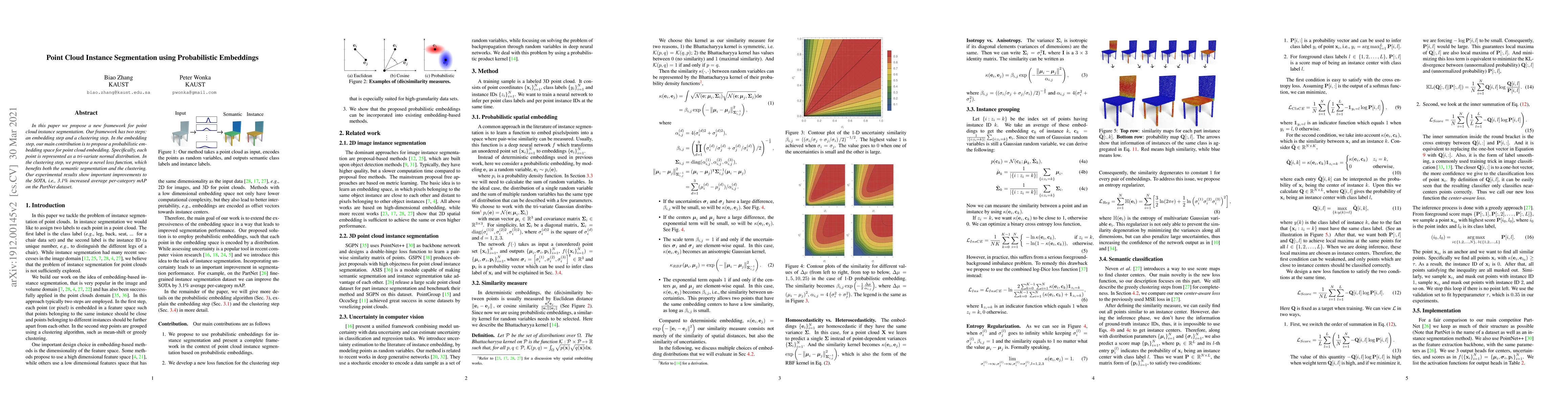 This paper introduces a novel framework for point cloud instance segmentation, featuring a probabilistic embedding space where each point is represented as a tri-variate normal distribution, followed by a clustering step with a new loss function. Experimental results show a 3.1% improvement in average per-category mAP on the PartNet dataset.