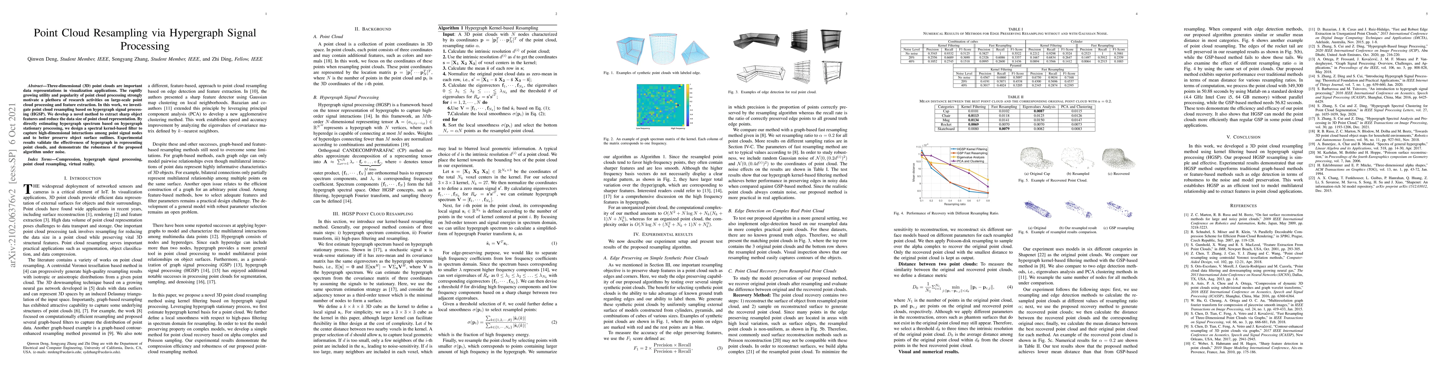 Three-dimensional (3D) point clouds are important data representations in visualization applications. The rapidly growing utility and popularity of point cloud processing strongly motivate a plethora of research activities on large-scale point cloud processing and feature extraction. In this work, we investigate point cloud resampling based on hypergraph signal processing (HGSP). We develop a novel method to extract sharp object features and reduce the data size of point cloud representation. By directly estimating hypergraph spectrum based on hypergraph stationary processing, we design a spectral kernel-based filter to capture high-dimensional interactions among point signal nodes and to better preserve object surface outlines. Experimental results validate the effectiveness of hypergraph in representing point clouds, and demonstrate the robustness of the proposed algorithm under noise.