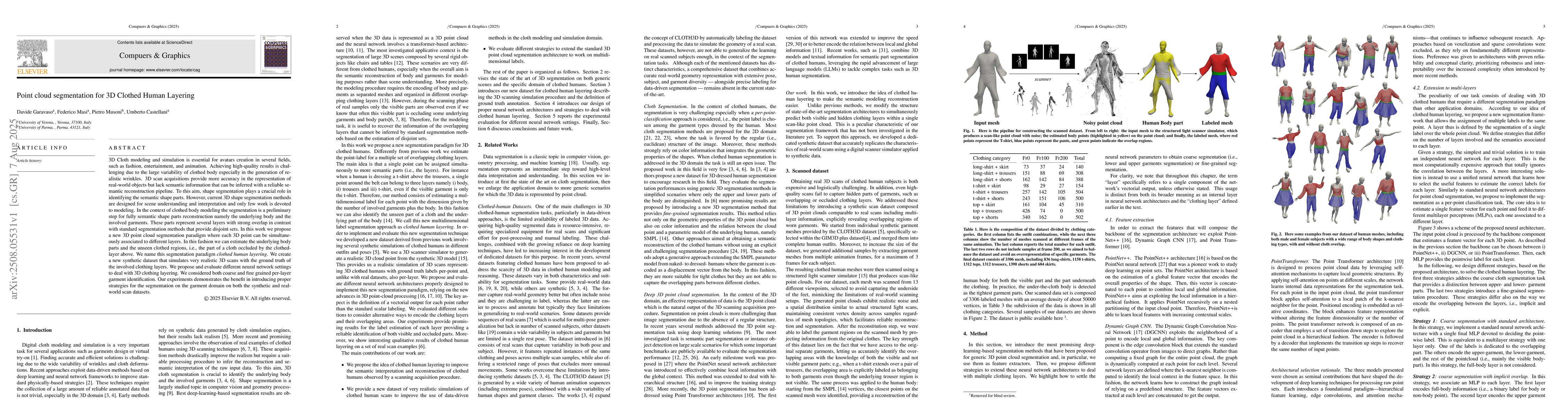 3D Cloth modeling and simulation is essential for avatars creation in several fields, such as fashion, entertainment, and animation. Achieving high-quality results is challenging due to the large variability of clothed body especially in the generation of realistic wrinkles. 3D scan acquisitions provide more accuracy in the representation of real-world objects but lack semantic information that can be inferred with a reliable semantic reconstruction pipeline. To this aim, shape segmentation plays a crucial role in identifying the semantic shape parts. However, current 3D shape segmentation methods are designed for scene understanding and interpretation and only few work is devoted to modeling. In the context of clothed body modeling the segmentation is a preliminary step for fully semantic shape parts reconstruction namely the underlying body and the involved garments. These parts represent several layers with strong overlap in contrast with standard segmentation methods that provide disjoint sets. In this work we propose a new 3D point cloud segmentation paradigm where each 3D point can be simultaneously associated to different layers. In this fashion we can estimate the underlying body parts and the unseen clothed regions, i.e., the part of a cloth occluded by the clothed-layer above. We name this segmentation paradigm clothed human layering. We create a new synthetic dataset that simulates very realistic 3D scans with the ground truth of the involved clothing layers. We propose and evaluate different neural network settings to deal with 3D clothing layering. We considered both coarse and fine grained per-layer garment identification. Our experiments demonstrates the benefit in introducing proper strategies for the segmentation on the garment domain on both the synthetic and real-world scan datasets.