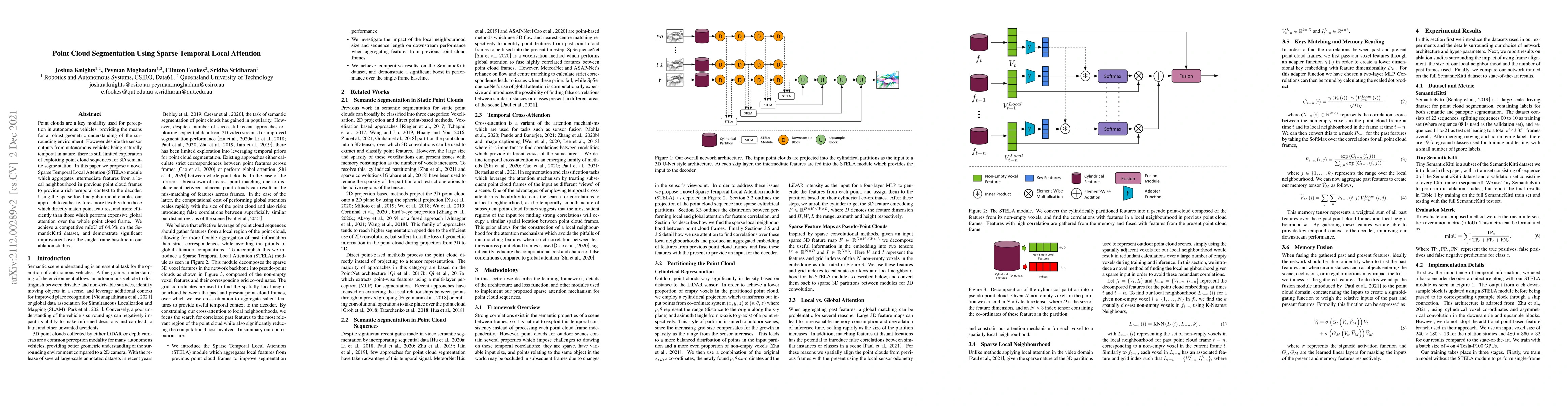 This paper introduces a Sparse Temporal Local Attention (STELA) module for point cloud segmentation in autonomous vehicles, which leverages local neighborhood features from previous frames to enhance temporal context. This approach achieves a competitive mean Intersection over Union (mIoU) of 64.3% on the SemanticKitti dataset, demonstrating significant improvement over single-frame baselines.