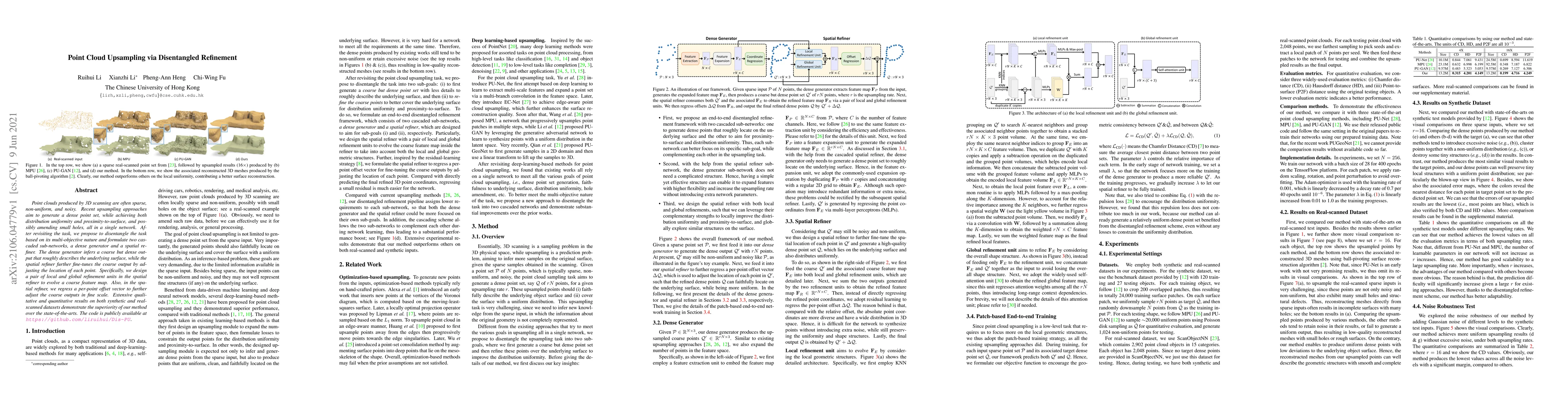 This paper proposes a two-stage network for upsampling sparse point clouds: a dense generator creates a coarse but dense point set, followed by a spatial refiner that fine-tunes the points' locations using local and global refinement units and per-point offset vectors. The method outperforms existing approaches in generating uniform and surface-proximal dense point clouds.