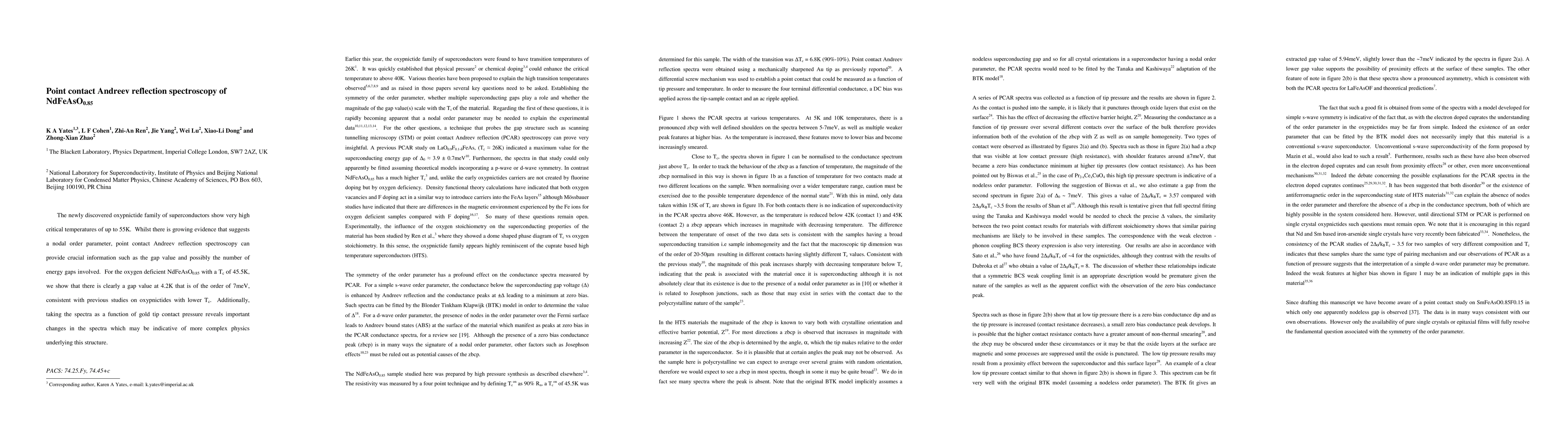 The newly discovered oxypnictide family of superconductors show very high critical temperatures of up to 55K. Whilst there is growing evidence that suggests a nodal order parameter, point contact Andreev reflection spectroscopy can provide crucial information such as the gap value and possibly the number of energy gaps involved. For the oxygen deficient NdFeAsO0.85 with a Tc of 45.5K, we show that there is clearly a gap value at 4.2K that is of the order of 7meV, consistent with previous studies on oxypnictides with lower Tc. Additionally, taking the spectra as a function of gold tip contact pressure reveals important changes in the spectra which may be indicative of more complex physics underlying this structure.