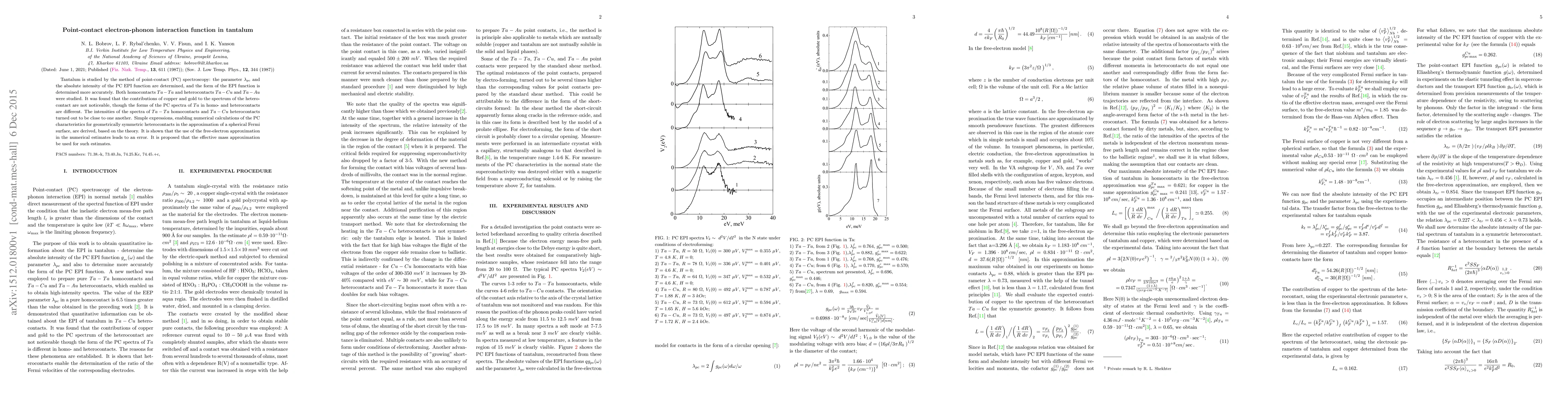 Tantalum is studied by the method of point-contact (PC) spectroscopy: the parameter ${{\lambda }_{pc}}$ and the absolute intensity of the PC EPI function are determined, and the form of the EPI function is determined more accurately. Both homocontacts $Ta-Ta$ and heterocontacts $Ta-Cu$ and $Ta-Au$ were studied. It was found that the contributions of copper and gold to the spectrum of the heterocontact are not noticeable, though the forms of the PC spectra of $Ta$ in homo- and heterocontacts are different. The intensities of the spectra of $Ta-Ta$ homocontacts and $Ta-Cu$ heterocontacts turned out to be close to one another. Simple expressions, enabling numerical calculations of the PC characteristics for geometrically symmetric heterocontacts in the approximation of a spherical Fermi surface, are derived, based on the theory. It is shown that the use of the free-electron approximation in the numerical estimates leads to an error. It is proposed that the effective mass approximation be used for such estimates.