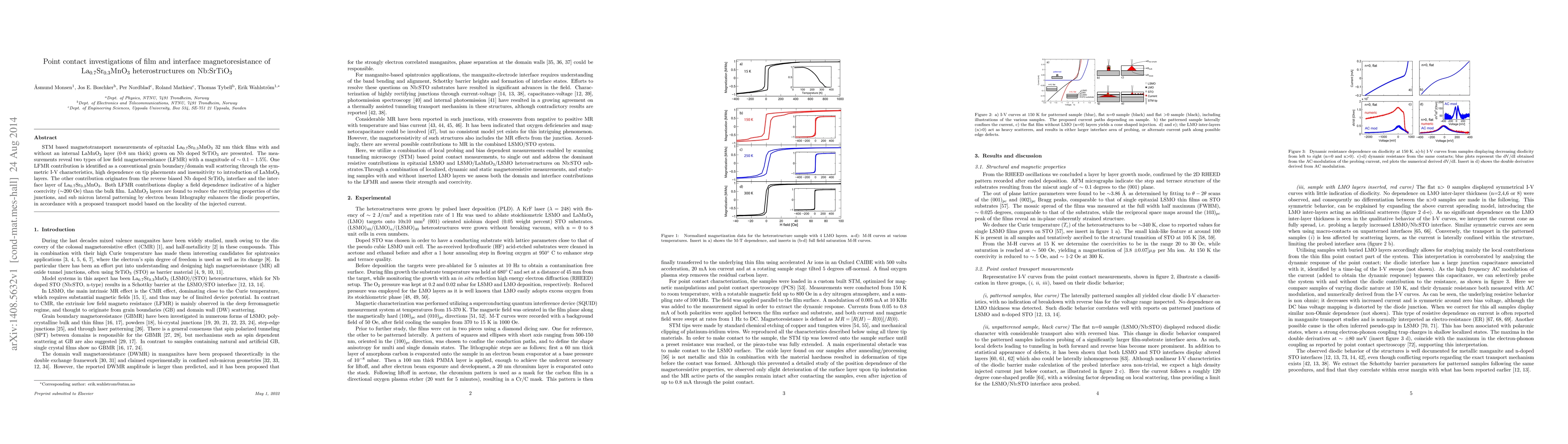 STM based magnetotransport measurements of epitaxial La$_{0.7}$Sr$_{0.3}$MnO$_3$ 32 nm thick films with and without an internal LaMnO$_3$ layer (0-8 nm thick) grown on Nb doped SrTiO$_3$ are presented. The measurements reveal two types of low field magnetoresistance (LFMR) with a magnitude of $\sim 0.1-1.5\%$. One LFMR contribution is identified as a conventional grain boundary/domain wall scattering through the symmetric I-V characteristics, high dependence on tip placements and insensitivity to introduction of LaMnO$_3$ layers. The other contribution originates from the reverse biased Nb doped SrTiO$_3$ interface and the interface layer of La$_{0.7}$Sr$_{0.3}$MnO$_3$. Both LFMR contributions display a field dependence indicative of a higher coercivity ($\sim$200 Oe) than the bulk film. LaMnO$_3$ layers are found to reduce the rectifying properties of the junctions, and sub micron lateral patterning by electron beam lithography enhances the diodic properties, in accordance with a proposed transport model based on the locality of the injected current.