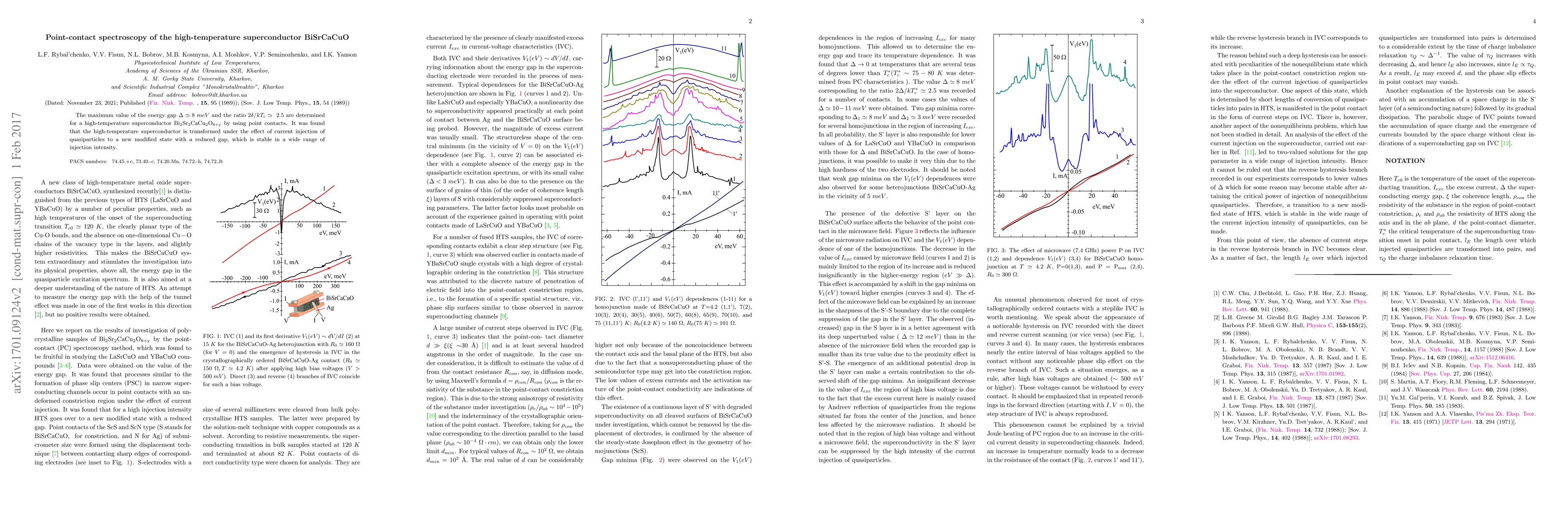 The maximum value of the energy gap $\Delta\simeq 8\ meV$ and the ratio $2\delta/kT_c\simeq~2.5$ are determined for a high-temperature superconductor $\rm Bi_2Sr_2CaCu_2O_{8+y}$ by using point contacts. It was found that the high-temperature superconductor is transformed under the effect of current injection of quasiparticles to a new modified state with a reduced gap, which is stable in a wide range of injection intensity.