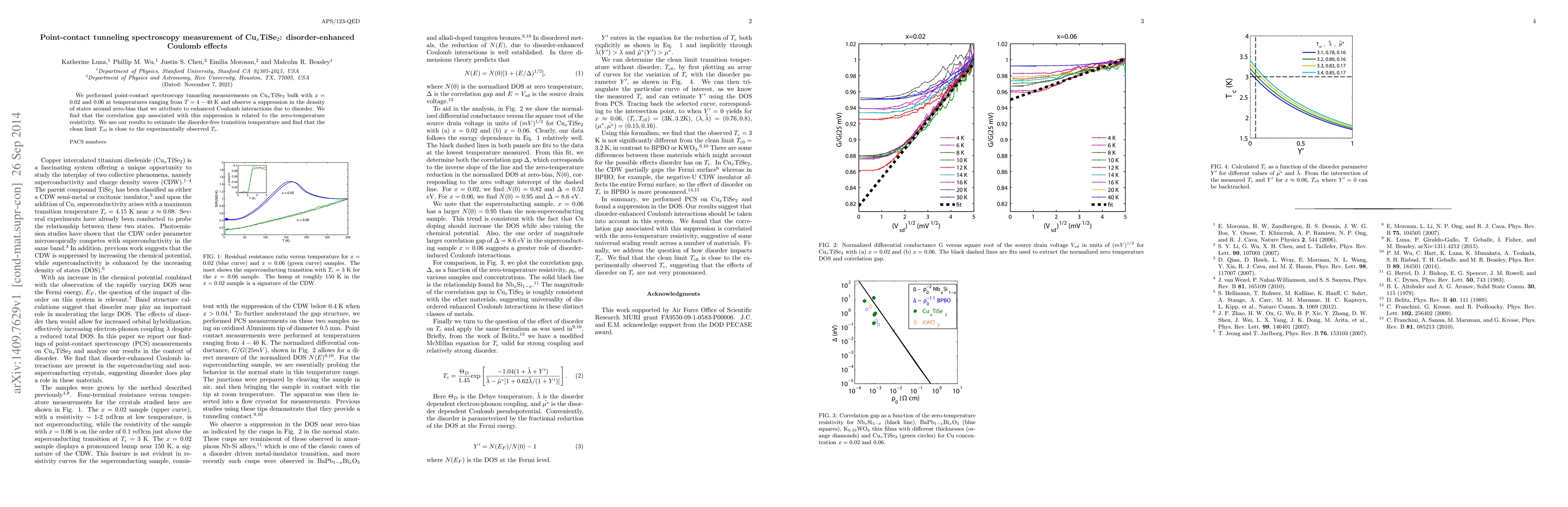 We performed point-contact spectroscopy tunneling measurements on Cu$_x$TiSe$_2$ bulk with $x=0.02$ and $0.06$ at temperatures ranging from $T=4-40$ K and observe a suppression in the density of states around zero-bias that we attribute to enhanced Coulomb interactions due to disorder. We find that the correlation gap associated with this suppression is related to the zero-temperature resistivity. We use our results to estimate the disorder-free transition temperature and find that the clean limit $T_{c0}$ is close to the experimentally observed $T_c$.