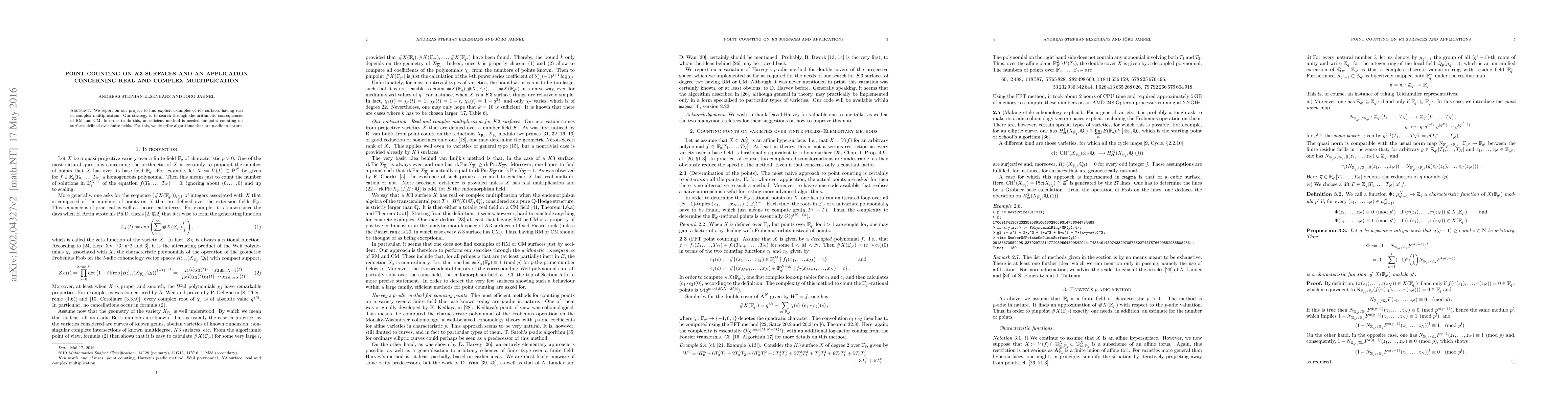 We report on our project to find explicit examples of $K3$ surfaces having real or complex multiplication. Our strategy is to search through the arithmetic consequences of RM and CM. In order to do this, an efficient method is needed for point counting on surfaces defined over finite fields. For this, we describe algorithms that are $p$-adic in nature.