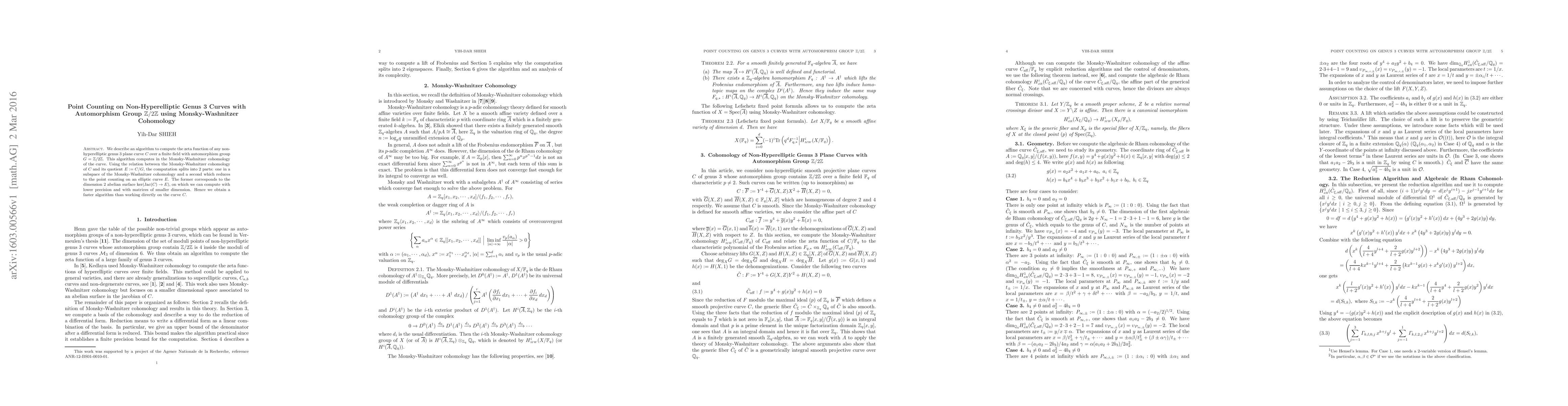 This paper presents an algorithm for computing the zeta function of non-hyperelliptic genus 3 curves with a $\mathbb{Z} / 2 \mathbb{Z}$ automorphism group using Monsky-Washnitzer cohomology. The method splits the computation into two parts, one involving the abelian surface kernel and the other reducing to point counting on an elliptic curve, leading to a faster algorithm.