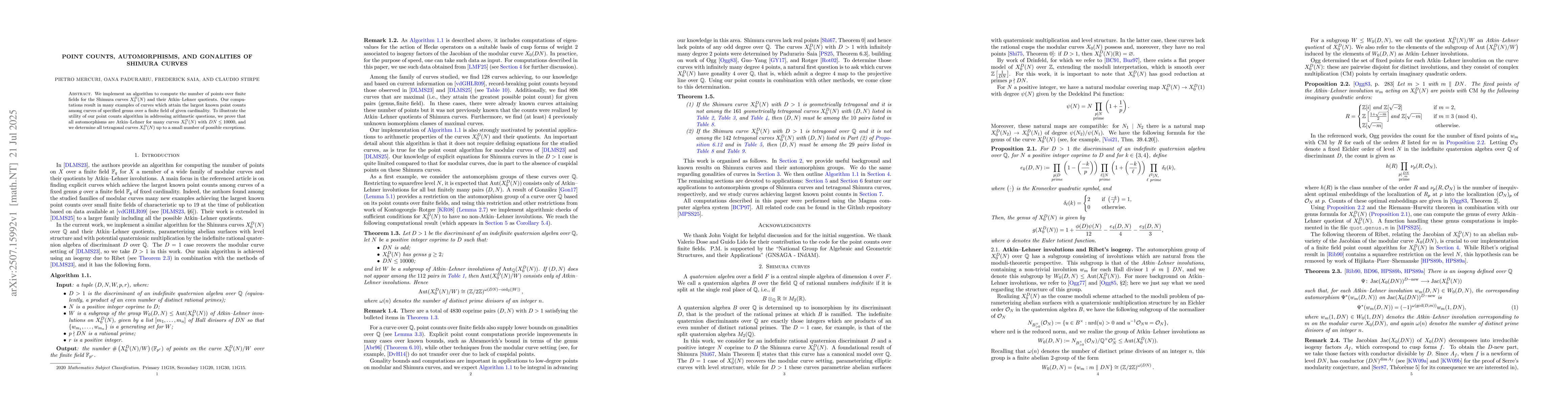 We implement an algorithm to compute the number of points over finite fields for the Shimura curves $X_0^D(N)$ and their Atkin--Lehner quotients. Our computations result in many examples of curves which attain the largest known point counts among curves of specified genus over a finite field of given cardinality. To illustrate the utility of our point counts algorithm in addressing arithmetic questions, we prove that all automorphisms are Atkin--Lehner for many curves $X_0^D(N)$ with $DN\leq 10000$, and we determine all tetragonal curves $X_0^D(N)$ up to a small number of possible exceptions.