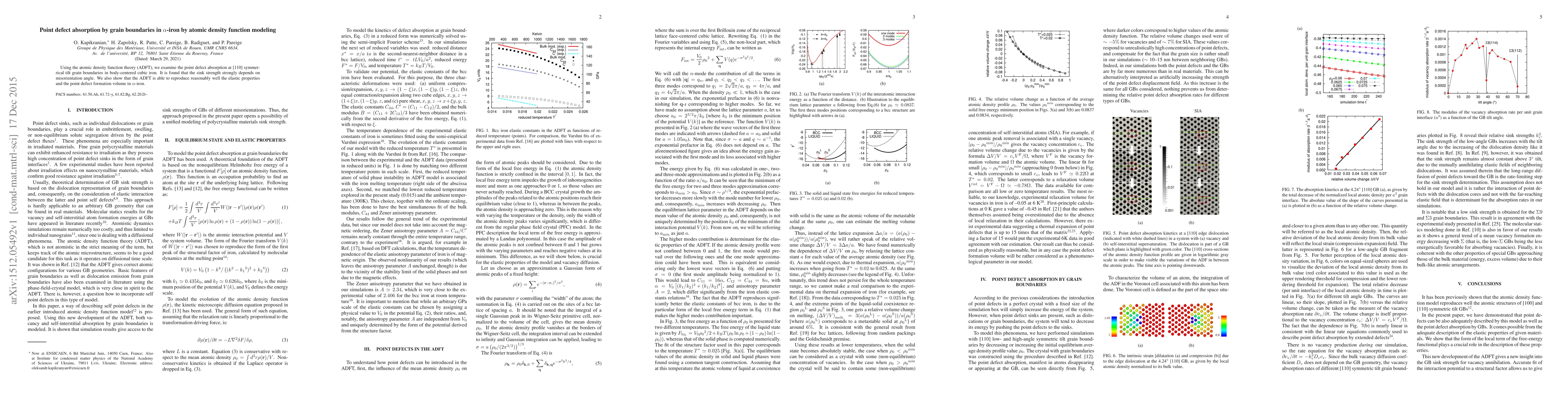 Summary: This study employs atomic density function theory to analyze the absorption of point defects at [110] symmetrical tilt grain boundaries in body-centered cubic iron, revealing a strong dependence of sink strength on misorientation angle. The method also accurately reproduces elastic properties and point defect formation volume in $\alpha$-iron.