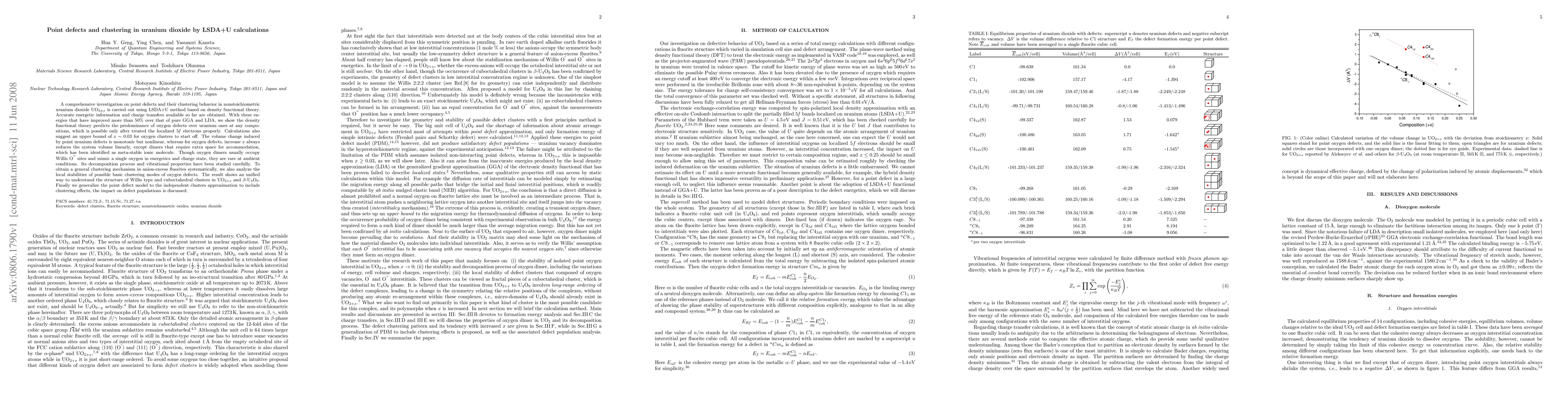 This study investigates point defects and clustering in nonstoichiometric uranium dioxide (UO2+x) using LSDA+U density functional theory, revealing oxygen defects predominate over uranium ones due to proper treatment of localized 5f electrons. The research highlights an upper bound for oxygen clustering and discusses the structural implications of oxygen dimers and their decomposition.