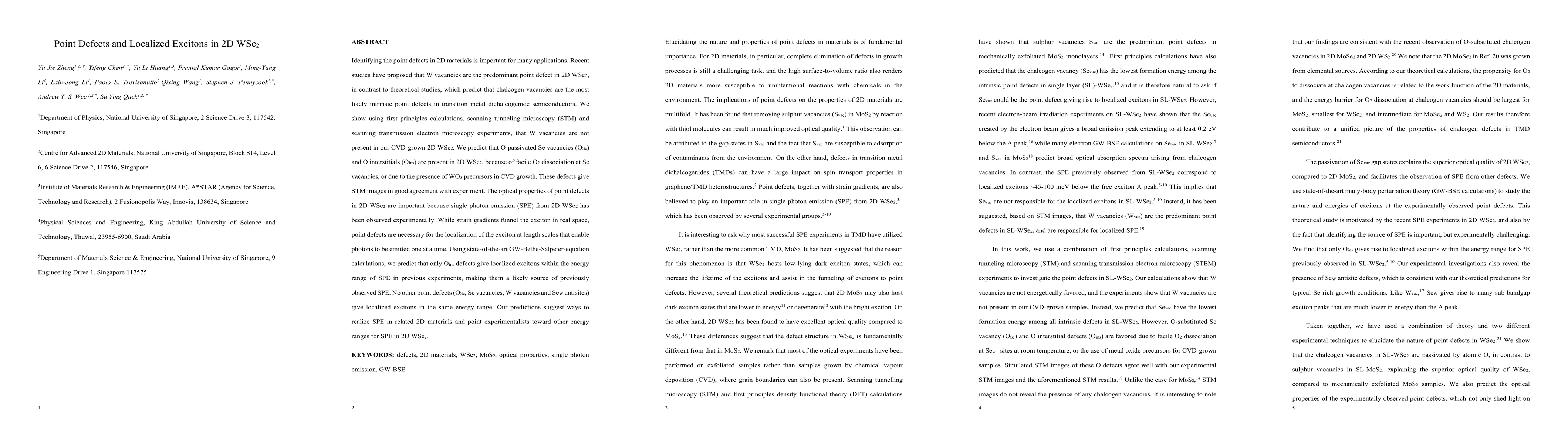 This paper identifies that O-passivated Se vacancies and O interstitials are the predominant point defects in CVD-grown 2D WSe2, contrary to previous predictions. It concludes that O interstitials are the likely source of localized excitons and single photon emission observed in experiments.
