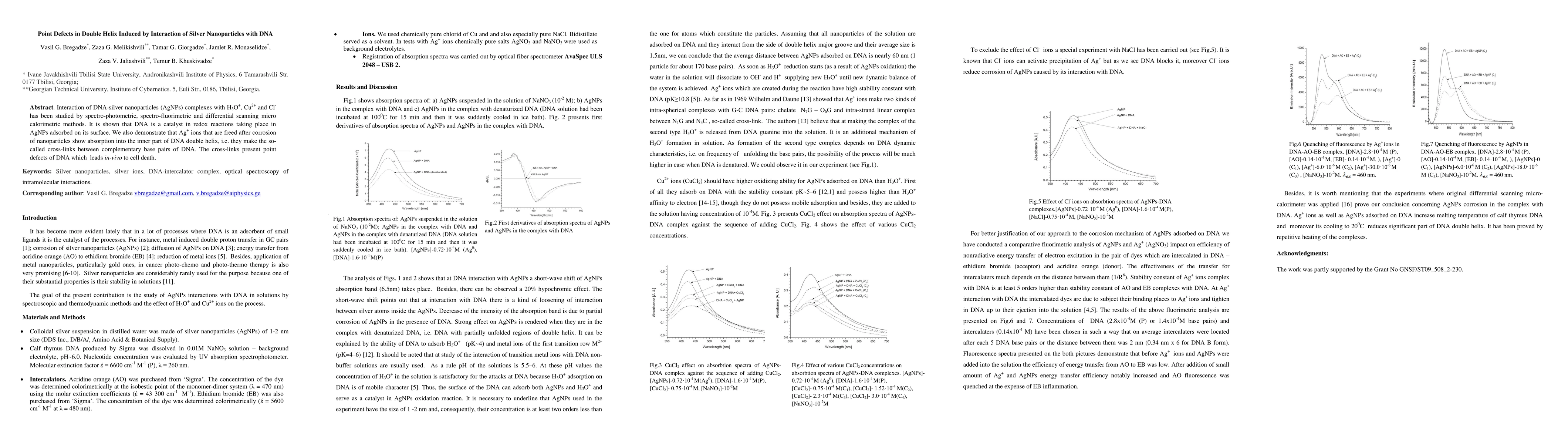 Interaction of DNA-silver nanoparticles (AgNPs) complexes with H3O+, Cu2+ and Cl- has been studied by spectro-photometric, spectro-fluorimetric and differential scanning micro calorimetric methods. It is shown that DNA is a catalyst in redox reactions taking place in AgNPs adsorbed on its surface. We also demonstrate that Ag+ ions that are freed after corrosion of nanoparticles show absorption into the inner part of DNA double helix, i.e. they make the so-called cross-links between complementary base pairs of DNA. The cross-links present point defects of DNA which leads in-vivo to cell death.