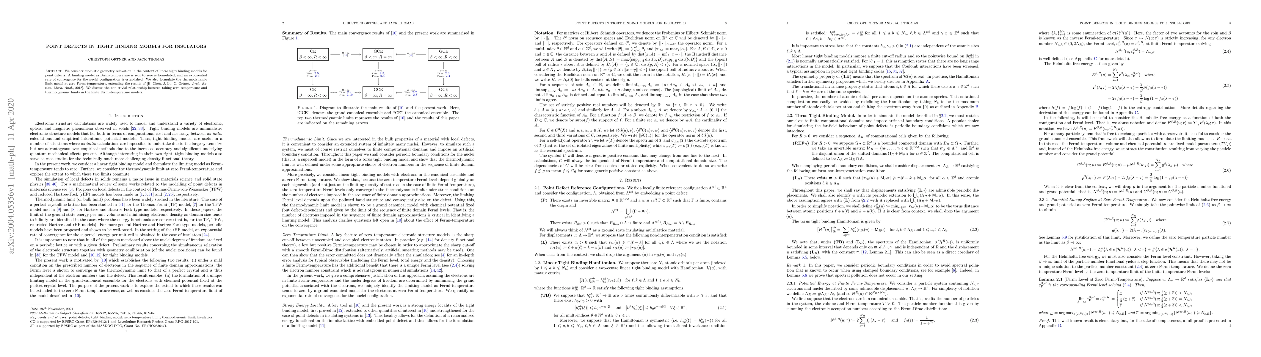 This paper explores point defects in tight binding models for insulators, finding an exponential rate of convergence for nuclei configuration at low Fermi-temperature, and establishing a relationship between zero temperature and thermodynamic limits.