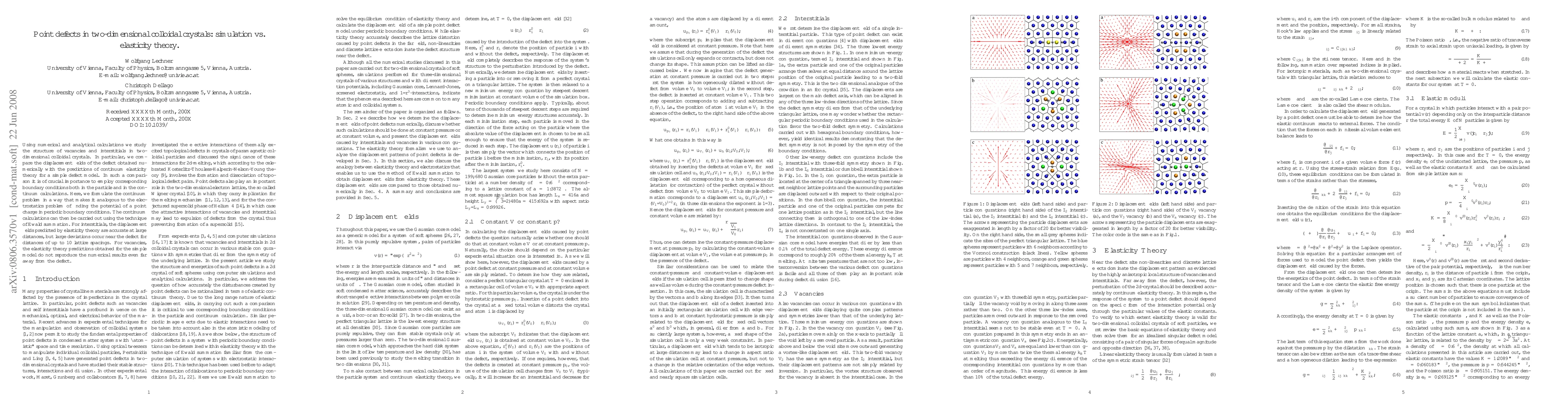 This paper compares numerical simulations of point defects in two-dimensional colloidal crystals with predictions from continuum elasticity theory, finding that while the theory works well for interstitials at larger distances, it fails to match numerical results for vacancies even at greater distances. The study emphasizes the importance of matching boundary conditions in both numerical and theoretical approaches.