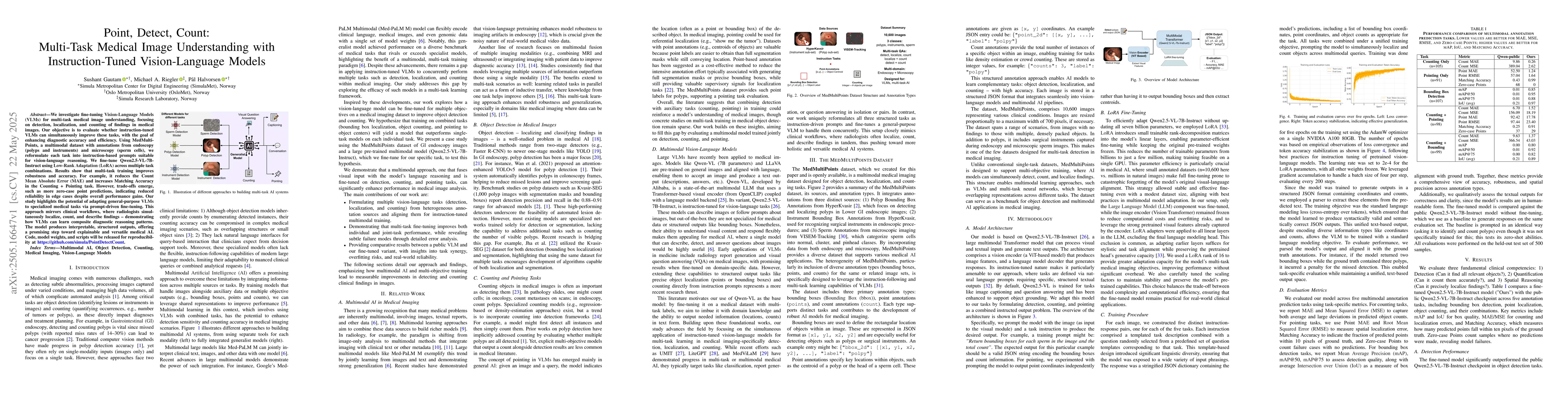 We investigate fine-tuning Vision-Language Models (VLMs) for multi-task medical image understanding, focusing on detection, localization, and counting of findings in medical images. Our objective is to evaluate whether instruction-tuned VLMs can simultaneously improve these tasks, with the goal of enhancing diagnostic accuracy and efficiency. Using MedMultiPoints, a multimodal dataset with annotations from endoscopy (polyps and instruments) and microscopy (sperm cells), we reformulate each task into instruction-based prompts suitable for vision-language reasoning. We fine-tune Qwen2.5-VL-7B-Instruct using Low-Rank Adaptation (LoRA) across multiple task combinations. Results show that multi-task training improves robustness and accuracy. For example, it reduces the Count Mean Absolute Error (MAE) and increases Matching Accuracy in the Counting + Pointing task. However, trade-offs emerge, such as more zero-case point predictions, indicating reduced reliability in edge cases despite overall performance gains. Our study highlights the potential of adapting general-purpose VLMs to specialized medical tasks via prompt-driven fine-tuning. This approach mirrors clinical workflows, where radiologists simultaneously localize, count, and describe findings - demonstrating how VLMs can learn composite diagnostic reasoning patterns. The model produces interpretable, structured outputs, offering a promising step toward explainable and versatile medical AI. Code, model weights, and scripts will be released for reproducibility at https://github.com/simula/PointDetectCount.