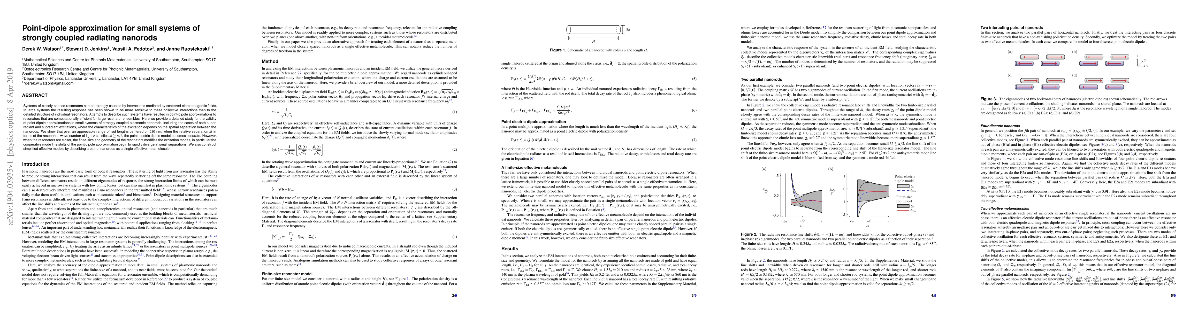 Systems of closely-spaced resonators can be strongly coupled by interactions mediated by scattered electromagnetic fields. In large systems the resulting response has been shown to be more sensitive to these collective interactions than to the detailed structure of individual resonators. Attempts to describe such systems have resulted in point-dipole approximations to resonators that are computationally efficient for large resonator ensembles. Here we provide a detailed study for the validity of point dipole approximations in small systems of strongly coupled plasmonic nanorods, including the cases of both super-radiant and subradiant excitations, where the characteristics of the excitation depends on the spatial separation between the nanorods. We show that over an appreciable range of rod lengths centered on $210~\text{nm}$, when the relative separation $kl$ in terms of the resonance wave number of light $k$ satisfies $kl \gtrsim \pi/2$, the point electric dipole model becomes accurate. However, when the resonators are closer, the finite-size and geometry of the resonators modifies the excitation modes, in particular the cooperative mode line shifts of the point dipole approximation begin to rapidly diverge at small separations. We also construct simplified effective models by describing a pair of nanorods as a single effective metamolecule.