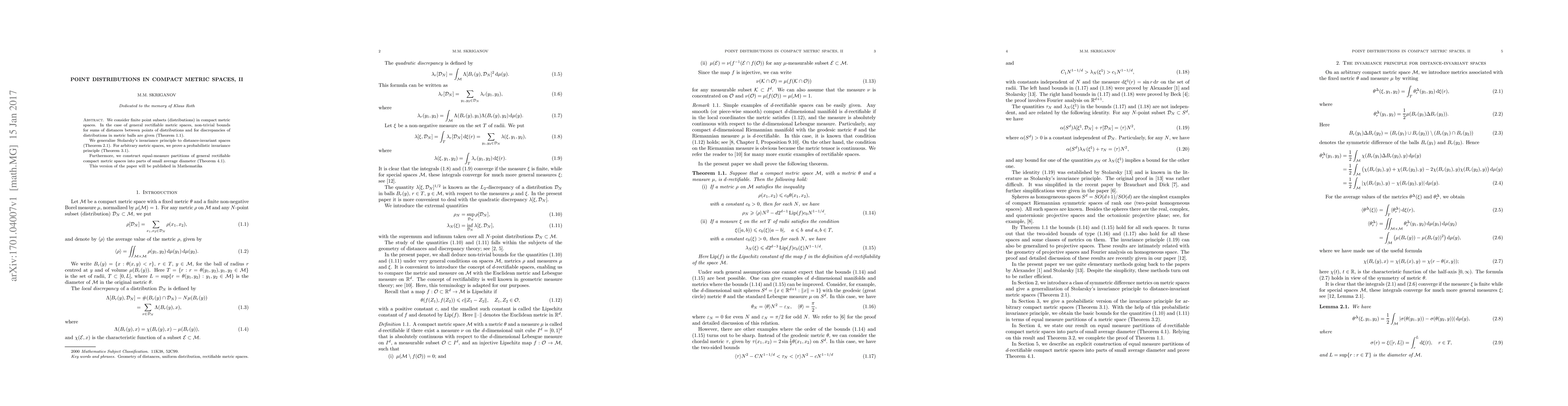 This paper explores finite point distributions in compact metric spaces, providing bounds for distances and discrepancies in rectifiable spaces, and generalizing Stolarsky's invariance principle. It also proves a probabilistic invariance principle and constructs partitions with small average diameters. Published in Mathematika, the work advances the understanding of metric space distributions and their properties.